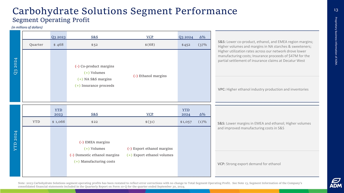 Proprietary business information of ADM. 12 Ag Services & Oilseeds Segment Performance Segment Operating Profit (in millions of dollars) Ag Services: Lower South American origination margins and Q3 2023 Ag Services Crushing RPO Wilmar Q3 2024Δ% volumes; Industry take or pay contracts; $48M of insurance Quarter $ 848 $(119) $(63) $(213) $27 $480 (43)% proceeds in the prior year related to Hurricane Ida (-) SA origination (+) Global soy crush (-) Refining margins Crushing: ~$15 per ton increase in executed soy crush margins margins (-) Biodiesel margins more than offset by lower canola crush margins and (-) Global trade (-) Canola crush margins higher manufacturing costs; Insurance proceeds of $24M for margins margins (-) ~$120 YoY net partial settlement of insurance claims at Decatur East and (+) Global trade and (-) Manufacturing timing impacts West NA origination costs volumes (-) ~$100 YoY net timing impacts RPO: Increased pre-treatment capacity and imports of UCO negatively impacted RPO: negative timing impacts YTD 2023 Ag Services Crushing RPO Wilmar YTD 2024Δ% Ag Services: Lower South American origination margins and volumes; Industry take or pay contracts YTD $ 3,113 $(493) $(269) $(595) $47 $1,803 (42)% (-) SA origination (-) Global crush (-) Refining margins margins margins (-) Biodiesel Crushing: Lower global crush margins partially offset by (-) Commodity (+) Volumes margins improved volumes; Negative timing impacts Trading (-) Manufacturing (-) ~$360 YoY net (-) Global trade costs timing impacts margins (-) ~$120 YoY net (+) Global trade and timing impacts NA origination RPO: Increased pre-treatment capacity and imports of UCO volumes negatively impacted RPO; negative timing impacts Note: 2023 Ag Services & Oilseeds segment operating profits has been restated to reflect error corrections with no change to Total Segment Operating Profit. See Note 13, Segment Information of the Company’s consolidated financial statements included in the Quarterly Report on Form 10-Q for the quarter ended September 30, 2024. YTD 2024 Q3 2024