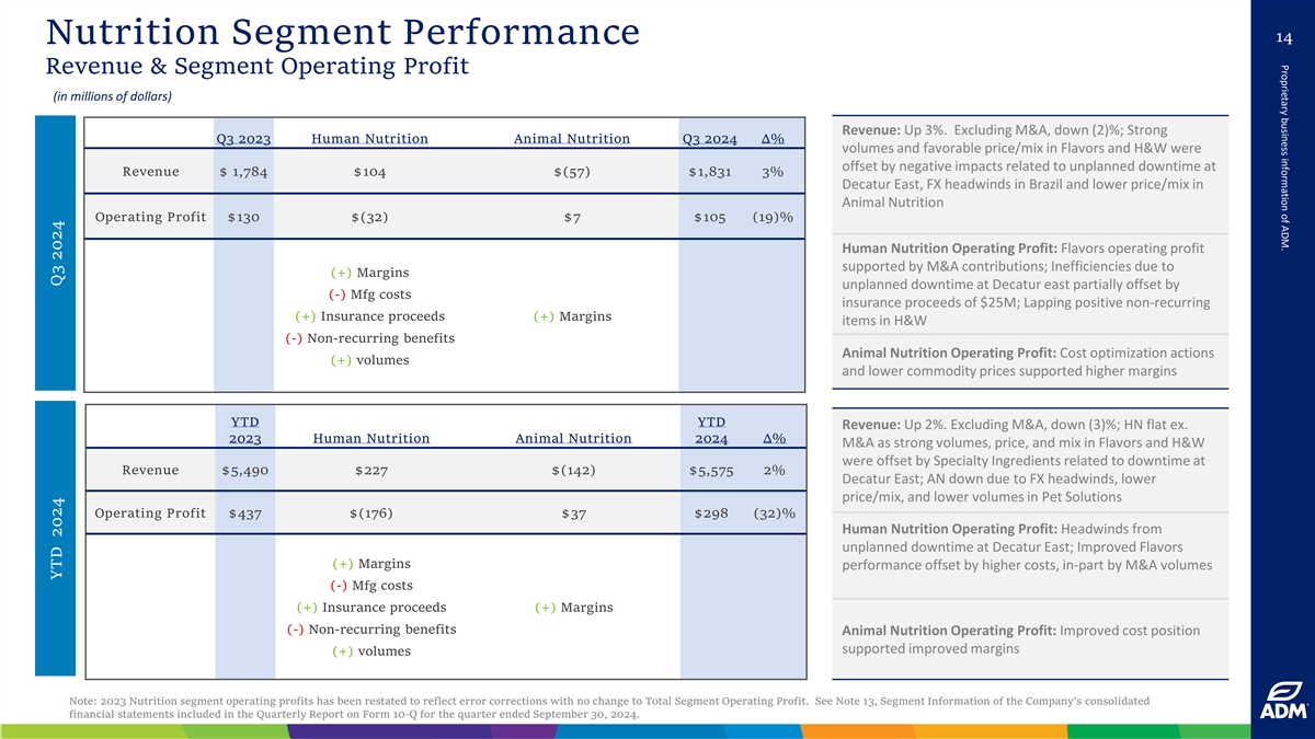 Proprietary business information of ADM. 13 Carbohydrate Solutions Segment Performance Segment Operating Profit (in millions of dollars) Q3 2023 S&S VCP Q3 2024Δ% S&S: Lower co-product, ethanol, and EMEA region margins; Quarter $ 468 $52 $(68) $452 (3)% Higher volumes and margins in NA starches & sweeteners; Higher utilization rates across our network drove lower manufacturing costs; Insurance proceeds of $47M for the partial settlement of insurance claims at Decatur West (-) Co-product margins (+) Volumes (-) Ethanol margins (+) NA S&S margins (+) Insurance proceeds VPC: Higher ethanol industry production and inventories YTD YTD 2023 S&S VCP 2024Δ% YTD $ 1,066 $22 $(31) $1,057 (1)% S&S: Lower margins in EMEA and ethanol; Higher volumes and improved manufacturing costs in S&S (-) EMEA margins (+) Volumes (-) Export ethanol margins (-) Domestic ethanol margins (+) Export ethanol volumes (+) Manufacturing costs VCP: Strong export demand for ethanol Note: 2023 Carbohydrate Solutions segment operating profits has been restated to reflect error corrections with no change to Total Segment Operating Profit. See Note 13, Segment Information of the Company’s consolidated financial statements included in the Quarterly Report on Form 10-Q for the quarter ended September 30, 2024. YTDY Q3 TD 20 224 024 Q3 2024