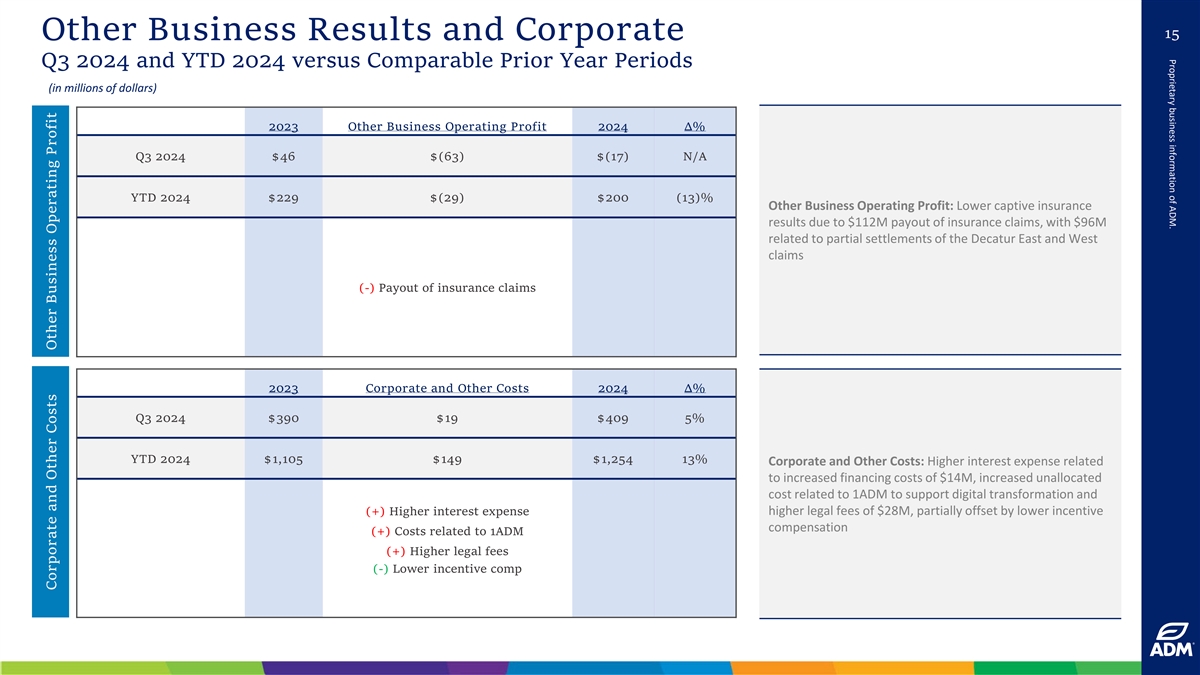 Proprietary business information of ADM. 14 Nutrition Segment Performance Revenue & Segment Operating Profit (in millions of dollars) Revenue: Up 3%. Excluding M&A, down (2)%; Strong Q3 2023 Human Nutrition Animal Nutrition Q3 2024Δ% volumes and favorable price/mix in Flavors and H&W were offset by negative impacts related to unplanned downtime at Revenue $ 1,784 $104 $(57) $1,831 3% Decatur East, FX headwinds in Brazil and lower price/mix in Animal Nutrition Operating Profit $130 $(32) $7 $105 (19)% Human Nutrition Operating Profit: Flavors operating profit supported by M&A contributions; Inefficiencies due to (+) Margins unplanned downtime at Decatur east partially offset by (-) Mfg costs insurance proceeds of $25M; Lapping positive non-recurring (+) Insurance proceeds (+) Margins items in H&W (-) Non-recurring benefits Animal Nutrition Operating Profit: Cost optimization actions (+) volumes and lower commodity prices supported higher margins YTD YTD Revenue: Up 2%. Excluding M&A, down (3)%; HN flat ex. 2023 Human Nutrition Animal Nutrition 2024Δ% M&A as strong volumes, price, and mix in Flavors and H&W were offset by Specialty Ingredients related to downtime at Revenue $5,490 $227 $(142) $5,575 2% Decatur East; AN down due to FX headwinds, lower price/mix, and lower volumes in Pet Solutions Operating Profit $437 $(176) $37 $298 (32)% Human Nutrition Operating Profit: Headwinds from unplanned downtime at Decatur East; Improved Flavors (+) Margins performance offset by higher costs, in-part by M&A volumes (-) Mfg costs (+) Insurance proceeds (+) Margins (-) Non-recurring benefits Animal Nutrition Operating Profit: Improved cost position supported improved margins (+) volumes Note: 2023 Nutrition segment operating profits has been restated to reflect error corrections with no change to Total Segment Operating Profit. See Note 13, Segment Information of the Company’s consolidated financial statements included in the Quarterly Report on Form 10-Q for the quarter ended September 30, 2024. YTD 2024 Q3 2024