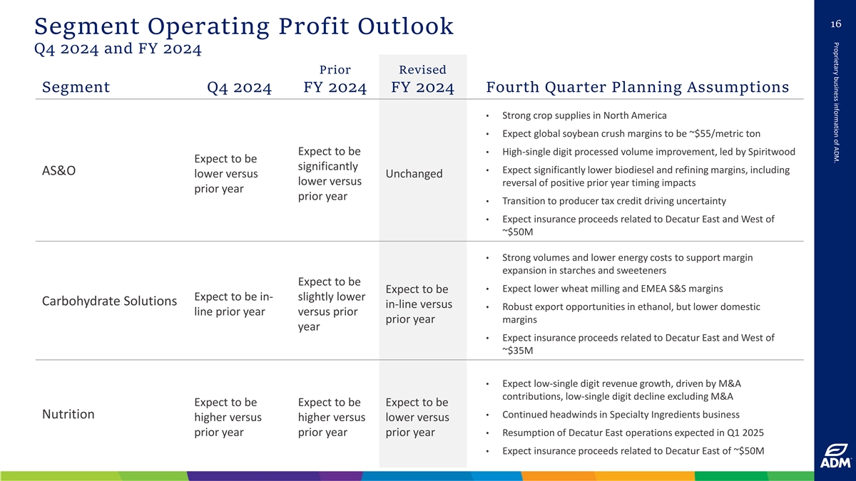 Proprietary business information of ADM. 15 Other Business Results and Corporate Q3 2024 and YTD 2024 versus Comparable Prior Year Periods (in millions of dollars) 2023 Other Business Operating Profit 2024Δ% Q3 2024 $46 $(63) $(17) N/A YTD 2024 $229 $(29) $200 (13)% Other Business Operating Profit: Lower captive insurance results due to $112M payout of insurance claims, with $96M related to partial settlements of the Decatur East and West claims (-) Payout of insurance claims 2023 Corporate and Other Costs 2024Δ% Q3 2024 $390 $19 $409 5% YTD 2024 $1,105 $149 $1,254 13% Corporate and Other Costs: Higher interest expense related to increased financing costs of $14M, increased unallocated cost related to 1ADM to support digital transformation and (+) Higher interest expense higher legal fees of $28M, partially offset by lower incentive compensation (+) Costs related to 1ADM (+) Higher legal fees (-) Lower incentive comp Corporate and Other Costs Other Business Operating Profit