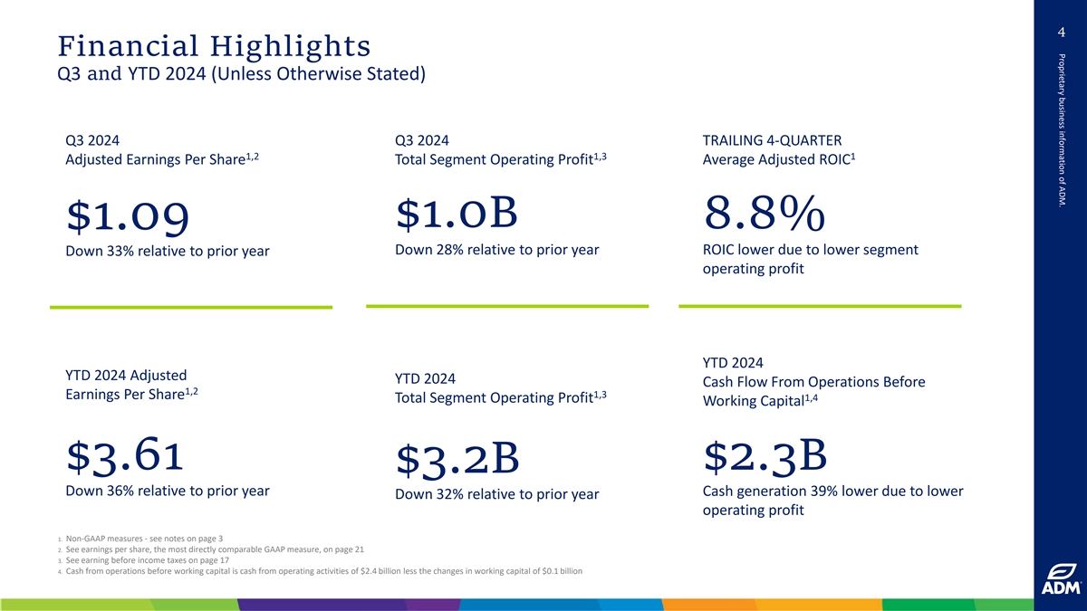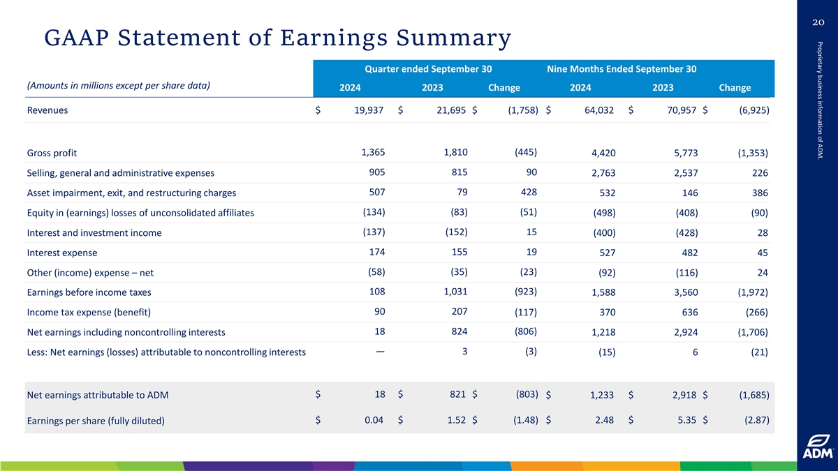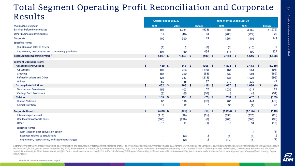 Proprietary business information of ADM. 17 Total Segment Operating Profit Reconciliation and Corporate Results Quarter Ended Sep. 30 Nine Months Ended Sep. 30 (Amounts in millions) 2024 2023 Change 2024 2023 Change Earnings before income taxes 108 1,031 (923) 1,588 3,560 (1,972) Other Business (earnings) loss 63 29 17 (46) (200) (229) Corporate 19 149 409 390 1,254 1,105 Specified items: (Gain) loss on sales of assets (1) 2 (3) (1) (10) 9 Impairment, restructuring and contingency provisions 435 327 504 69 517 190 (1) Total Segment Operating Profit $ 1,037 $ 1,446 $ (409) $ 3,158 $ 4,616 $ (1,458) Segment Operating Profit: Ag Services and Oilseeds $ 480 $ 848 $ (368) $ 1,803 $ 3,113 $ (1,310) Ag Services (119) (493) 107 226 461 954 Crushing (63) (269) 187 250 632 901 Refined Products and Other 124 337 (213) 431 1,026 (595) Wilmar 27 47 62 35 279 232 Carbohydrate Solutions $ 452 $ 468 $ (16) $ 1,057 $ 1,066 $ (9) Starches and Sweeteners 52 22 455 403 1,039 1,017 Vantage Corn Processors (3) 65 (68) 18 49 (31) Nutrition $ 105 $ 130 $ (25) $ 298 $ 437 $ (139) Human Nutrition (32) (176) 86 118 265 441 Animal Nutrition 7 37 19 12 33 (4) $ (409) $ (390) $ (19) $ (1,254) $ (1,105) $ (149) Corporate Results Interest expense – net (15) (25) (113) (98) (351) (326) Unallocated corporate costs (306) (298) (8) (903) (808) (95) Other (1) (18) 10 11 16 34 Specified items: Gain (loss) on debt conversion option — (6) — — — 6 Expenses related to acquisitions — (3) 3 (4) (6) 2 Impairment, restructuring, and settlement charges 2 (7) — (2) (12) (5) Explanatory note: The Company is revising its reconciliation and calculation of total segment operating profit. The revised reconciliation is presented in Note 13. Segment Information of the Company’s consolidated financial statements included in the Quarterly Report on Form 10-Q for the quarter ended September 30, 2024, which presents a subtotal for total segment operating profit that is equal to the sum of the segment operating profit reported for each of the Ag Services and Oilseeds, Carbohydrate Solutions and Nutrition segments. Amounts for Other business and specified items, which previously were reflected in the calculation of total segment operating profit, are now reflected as reconciling items, similar to Corporate, between total segment operating profit and earnings before income taxes. 1. Non-GAAP measure - see notes on page 3