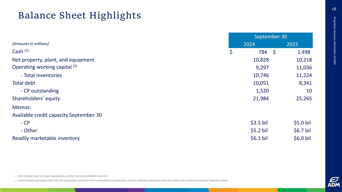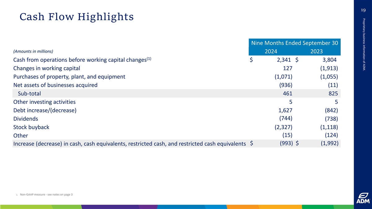 Proprietary business information of ADM. 18 Balance Sheet Highlights September 30 (Amounts in millions) 2024 2023 (1) Cash $ 784 $ 1,498 Net property, plant, and equipment 10,828 10,218 (2) Operating working capital 9,297 11,036 - Total inventories 10,746 11,224 Total debt 10,051 8,341 - CP outstanding 1,520 10 Shareholders’ equity 21,984 25,265 Memos: Available credit capacity September 30 - CP $3.5 bil $5.0 bil - Other $5.2 bil $6.7 bil Readily marketable inventory $6.1 bil $6.0 bil 1. Cash includes cash and cash equivalents and short-term marketable securities 2. Current assets (excluding cash and cash equivalents and short-term marketable securities) less current liabilities (excluding short-term debt and current maturities of long-term debt).
