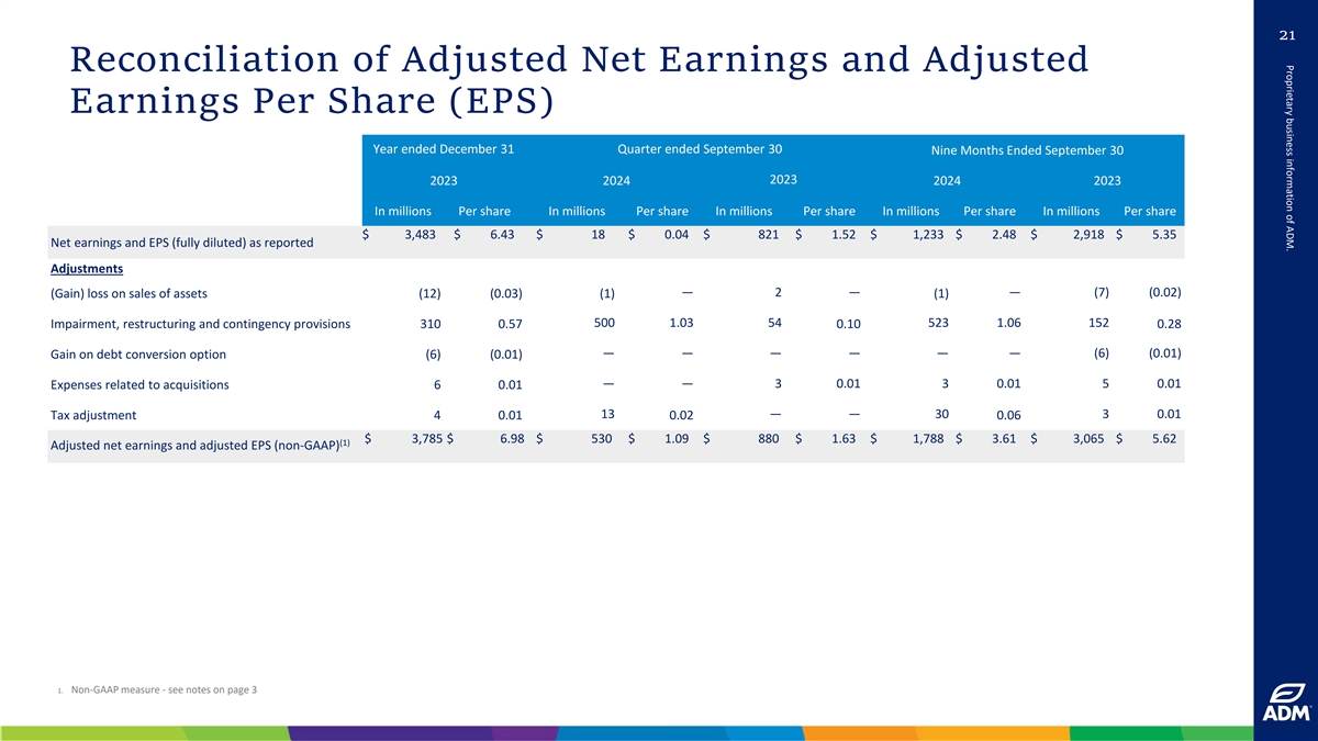Proprietary business information of ADM. 20 GAAP Statement of Earnings Summary Quarter ended September 30 Nine Months Ended September 30 (Amounts in millions except per share data) 2024 2023 Change 2024 2023 Change Revenues $ 19,937 $ 21,695 $ (1,758) $ 64,032 $ 70,957 $ (6,925) 1,365 1,810 (445) Gross profit 4,420 5,773 (1,353) 905 815 90 Selling, general and administrative expenses 2,763 2,537 226 507 79 428 Asset impairment, exit, and restructuring charges 532 146 386 (134) (83) (51) Equity in (earnings) losses of unconsolidated affiliates (498) (408) (90) (137) (152) 15 Interest and investment income (400) (428) 28 174 155 19 Interest expense 527 482 45 (58) (35) (23) Other (income) expense – net (92) (116) 24 108 1,031 (923) Earnings before income taxes 1,588 3,560 (1,972) 90 207 Income tax expense (benefit) (117) 370 636 (266) 18 824 (806) Net earnings including noncontrolling interests 1,218 2,924 (1,706) — 3 (3) Less: Net earnings (losses) attributable to noncontrolling interests (15) 6 (21) $ 18 $ 821 $ (803) Net earnings attributable to ADM $ 1,233 $ 2,918 $ (1,685) $ 0.04 $ 1.52 $ (1.48) $ 2.48 $ 5.35 $ (2.87) Earnings per share (fully diluted)