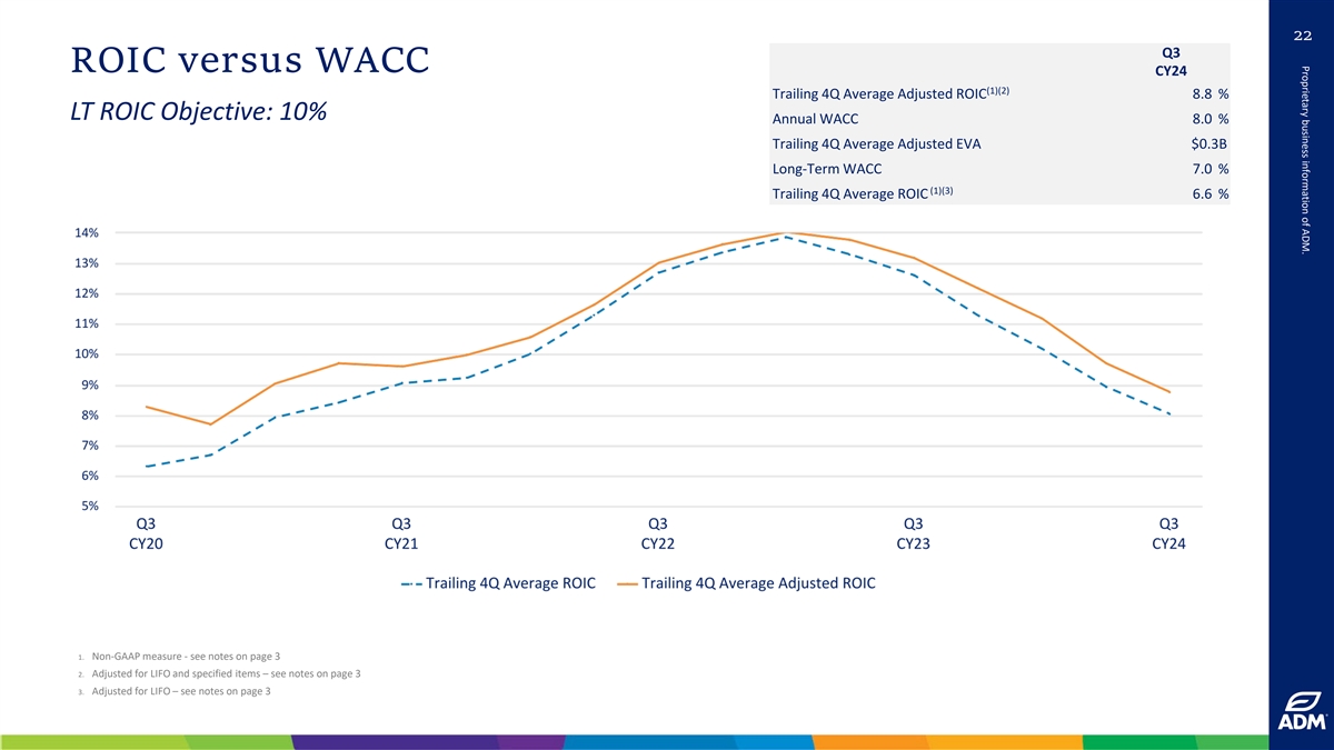 Proprietary business information of ADM. 21 Reconciliation of Adjusted Net Earnings and Adjusted Earnings Per Share (EPS) Year ended December 31 Quarter ended September 30 Nine Months Ended September 30 2023 2023 2024 2024 2023 In millions Per share In millions Per share In millions Per share In millions Per share In millions Per share $ 3,483 $ 6.43 $ 18 $ 0.04 $ 821 $ 1.52 $ 1,233 $ 2.48 $ 2,918 $ 5.35 Net earnings and EPS (fully diluted) as reported Adjustments — 2 — — (7) (0.02) (Gain) loss on sales of assets (12) (0.03) (1) (1) 500 1.03 54 523 1.06 152 Impairment, restructuring and contingency provisions 310 0.57 0.10 0.28 — — — — — — (6) (0.01) Gain on debt conversion option (6) (0.01) — — 3 0.01 3 0.01 5 0.01 Expenses related to acquisitions 6 0.01 13 — — 30 3 0.01 Tax adjustment 4 0.01 0.02 0.06 $ 3,785 $ 6.98 $ 530 $ 1.09 $ 880 $ 1.63 $ 1,788 $ 3.61 $ 3,065 $ 5.62 (1) Adjusted net earnings and adjusted EPS (non-GAAP) 1. Non-GAAP measure - see notes on page 3