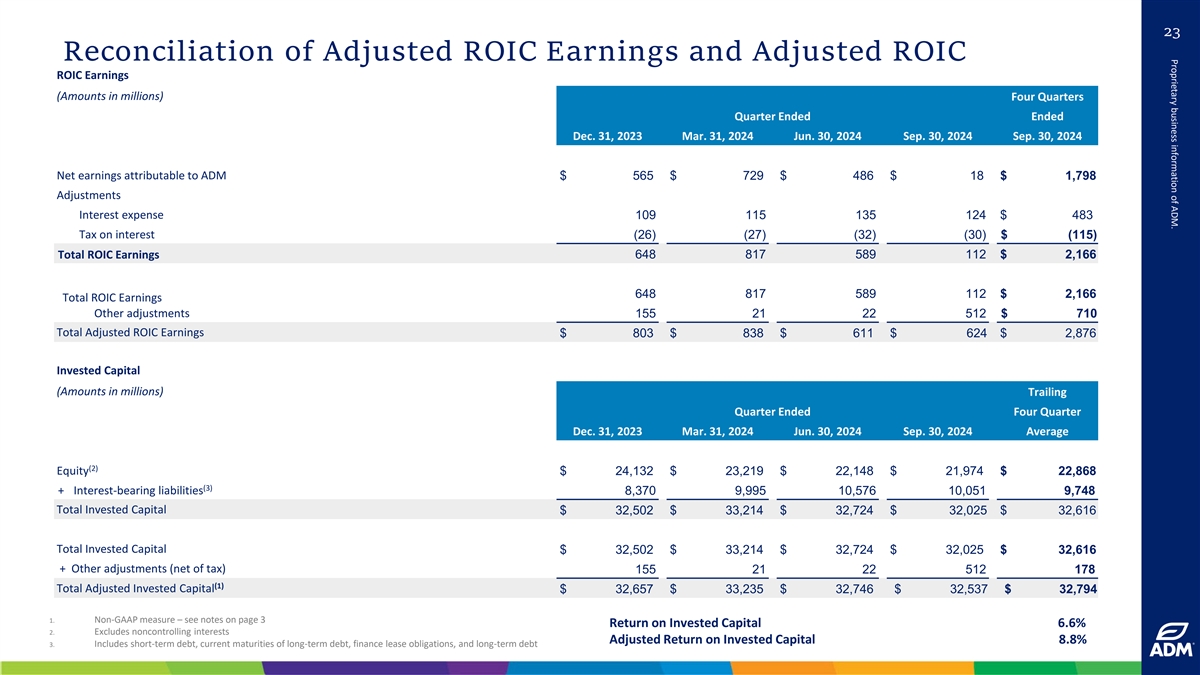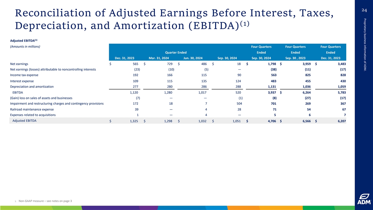 Proprietary business information of ADM. 23 Reconciliation of Adjusted ROIC Earnings and Adjusted ROIC ROIC Earnings (Amounts in millions) Four Quarters Quarter Ended Ended Dec. 31, 2023 Mar. 31, 2024 Jun. 30, 2024 Sep. 30, 2024 Sep. 30, 2024 Net earnings attributable to ADM $ 565 $ 729 $ 486 $ 18 $ 1,798 Adjustments Interest expense 109 115 135 124 $ 483 Tax on interest (26) (27) (32) (30) $ (115) Total ROIC Earnings 648 817 589 112 $ 2,166 648 817 589 112 $ 2,166 Total ROIC Earnings Other adjustments 155 21 22 512 $ 710 Total Adjusted ROIC Earnings $ 803 $ 838 $ 611 $ 624 $ 2,876 Invested Capital (Amounts in millions) Trailing Quarter Ended Four Quarter Dec. 31, 2023 Mar. 31, 2024 Jun. 30, 2024 Sep. 30, 2024 Average (2) Equity $ 24,132 $ 23,219 $ 22,148 $ 21,974 $ 22,868 (3) + Interest-bearing liabilities 8,370 9,995 10,576 10,051 9,748 Total Invested Capital $ 32,502 $ 33,214 $ 32,724 $ 32,025 $ 32,616 Total Invested Capital $ 32,502 $ 33,214 $ 32,724 $ 32,025 $ 32,616 + Other adjustments (net of tax) 155 21 22 512 178 (1) Total Adjusted Invested Capital $ 32,657 $ 33,235 $ 32,746 $ 32,537 $ 32,794 1. Non-GAAP measure – see notes on page 3 Return on Invested Capital 6.6% 2. Excludes noncontrolling interests Adjusted Return on Invested Capital 8.8% 3. Includes short-term debt, current maturities of long-term debt, finance lease obligations, and long-term debt