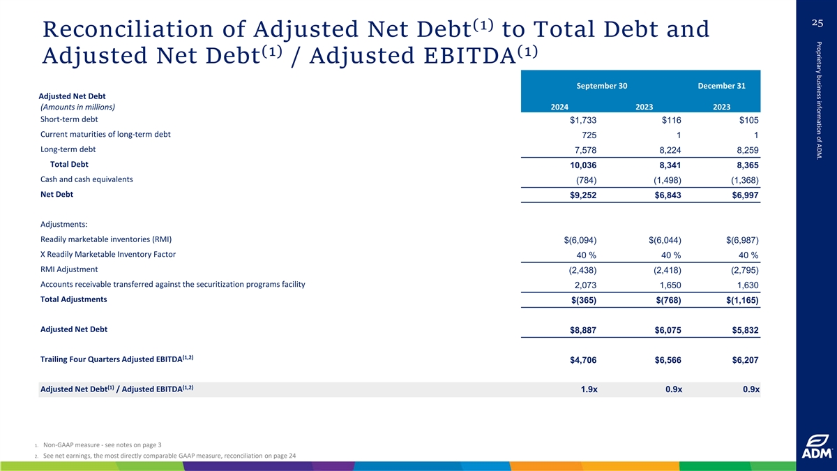 Proprietary business information of ADM. 24 Reconciliation of Adjusted Earnings Before Interest, Taxes, (1) Depreciation, and Amortization (EBITDA) (1) Adjusted EBITDA (Amounts in millions) Four Quarters Four Quarters Four Quarters Quarter Ended Ended Ended Ended Dec. 31, 2023 Mar. 31, 2024 Jun. 30, 2024 Sep. 30, 2024 Sep. 30, 2024 Sep. 30 , 2023 Dec. 31, 2023 Net earnings $ 565 $ 729 $ 486 $ 18 $ 1,798 $ 3,959 $ 3,483 Net earnings (losses) attributable to noncontrolling interests (23) (10) (5) — (38) (11) (17) Income tax expense 192 166 115 90 563 825 828 Interest expense 109 115 135 124 483 455 430 Depreciation and amortization 277 280 286 288 1,131 1,036 1,059 EBITDA 1,120 1,280 1,017 520 3,937 $ 6,264 5,783 (Gain) loss on sales of assets and businesses (7) — — (1) (8) (27) (17) Impairment and restructuring charges and contingency provisions 172 18 7 504 701 269 367 Railroad maintenance expense 39 — 4 28 71 54 67 Expenses related to acquisitions 1 — 4 — 5 6 7 Adjusted EBITDA $ 1,325 $ 1,298 $ 1,032 $ 1,051 $ 4,706 $ 6,566 $ 6,207 1. Non-GAAP measure – see notes on page 3