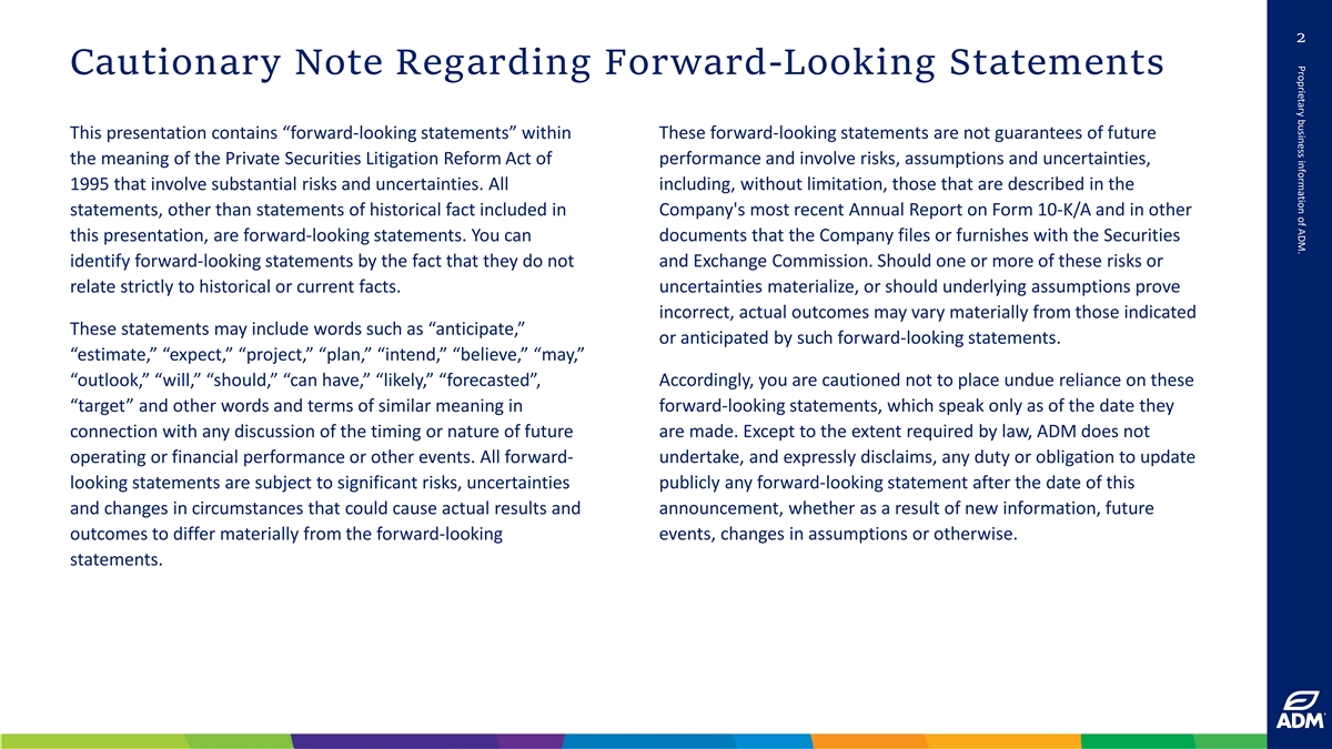 Proprietary business information of ADM. 2 Cautionary Note Regarding Forward-Looking Statements This presentation contains “forward-looking statements” within These forward-looking statements are not guarantees of future the meaning of the Private Securities Litigation Reform Act of performance and involve risks, assumptions and uncertainties, 1995 that involve substantial risks and uncertainties. All including, without limitation, those that are described in the statements, other than statements of historical fact included in Company's most recent Annual Report on Form 10-K/A and in other this presentation, are forward-looking statements. You can documents that the Company files or furnishes with the Securities identify forward-looking statements by the fact that they do not and Exchange Commission. Should one or more of these risks or relate strictly to historical or current facts. uncertainties materialize, or should underlying assumptions prove incorrect, actual outcomes may vary materially from those indicated These statements may include words such as “anticipate,” or anticipated by such forward-looking statements. “estimate,” “expect,” “project,” “plan,” “intend,” “believe,” “may,” “outlook,” “will,” “should,” “can have,” “likely,” “forecasted”, Accordingly, you are cautioned not to place undue reliance on these “target” and other words and terms of similar meaning in forward-looking statements, which speak only as of the date they connection with any discussion of the timing or nature of future are made. Except to the extent required by law, ADM does not operating or financial performance or other events. All forward- undertake, and expressly disclaims, any duty or obligation to update looking statements are subject to significant risks, uncertainties publicly any forward-looking statement after the date of this and changes in circumstances that could cause actual results and announcement, whether as a result of new information, future outcomes to differ materially from the forward-looking events, changes in assumptions or otherwise. statements.