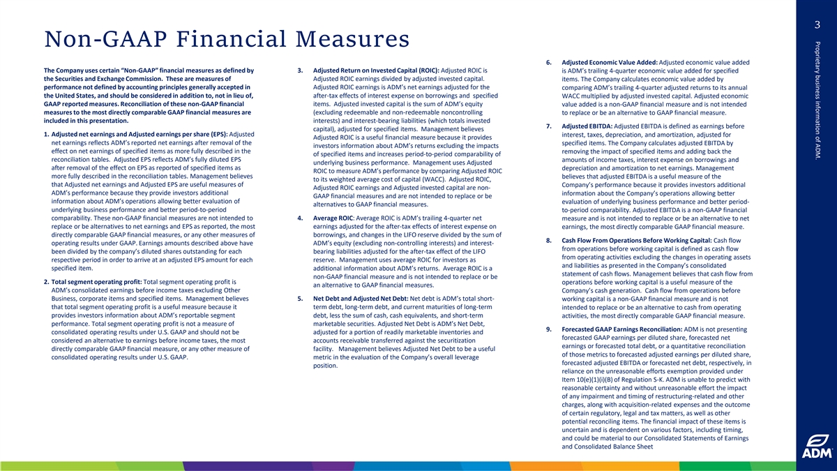 Proprietary business information of ADM. 3 Non-GAAP Financial Measures 6. Adjusted Economic Value Added: Adjusted economic value added The Company uses certain “Non-GAAP” financial measures as defined by 3. Adjusted Return on Invested Capital (ROIC): Adjusted ROIC is is ADM’s trailing 4-quarter economic value added for specified the Securities and Exchange Commission. These are measures of Adjusted ROIC earnings divided by adjusted invested capital. items. The Company calculates economic value added by performance not defined by accounting principles generally accepted in Adjusted ROIC earnings is ADM’s net earnings adjusted for the comparing ADM’s trailing 4-quarter adjusted returns to its annual the United States, and should be considered in addition to, not in lieu of, after-tax effects of interest expense on borrowings and specified WACC multiplied by adjusted invested capital. Adjusted economic GAAP reported measures. Reconciliation of these non-GAAP financial items. Adjusted invested capital is the sum of ADM’s equity value added is a non-GAAP financial measure and is not intended measures to the most directly comparable GAAP financial measures are (excluding redeemable and non-redeemable noncontrolling to replace or be an alternative to GAAP financial measure. included in this presentation. interests) and interest-bearing liabilities (which totals invested 7. Adjusted EBITDA: Adjusted EBITDA is defined as earnings before capital), adjusted for specified items. Management believes 1. Adjusted net earnings and Adjusted earnings per share (EPS): Adjusted interest, taxes, depreciation, and amortization, adjusted for Adjusted ROIC is a useful financial measure because it provides net earnings reflects ADM’s reported net earnings after removal of the specified items. The Company calculates adjusted EBITDA by investors information about ADM’s returns excluding the impacts effect on net earnings of specified items as more fully described in the removing the impact of specified items and adding back the of specified items and increases period-to-period comparability of reconciliation tables. Adjusted EPS reflects ADM’s fully diluted EPS amounts of income taxes, interest expense on borrowings and underlying business performance. Management uses Adjusted after removal of the effect on EPS as reported of specified items as depreciation and amortization to net earnings. Management ROIC to measure ADM’s performance by comparing Adjusted ROIC more fully described in the reconciliation tables. Management believes believes that adjusted EBITDA is a useful measure of the to its weighted average cost of capital (WACC). Adjusted ROIC, that Adjusted net earnings and Adjusted EPS are useful measures of Company’s performance because it provides investors additional Adjusted ROIC earnings and Adjusted invested capital are non- ADM’s performance because they provide investors additional information about the Company’s operations allowing better GAAP financial measures and are not intended to replace or be information about ADM’s operations allowing better evaluation of evaluation of underlying business performance and better period- alternatives to GAAP financial measures. underlying business performance and better period-to-period to-period comparability. Adjusted EBITDA is a non-GAAP financial comparability. These non-GAAP financial measures are not intended to 4. Average ROIC: Average ROIC is ADM’s trailing 4-quarter net measure and is not intended to replace or be an alternative to net replace or be alternatives to net earnings and EPS as reported, the most earnings adjusted for the after-tax effects of interest expense on earnings, the most directly comparable GAAP financial measure. directly comparable GAAP financial measures, or any other measures of borrowings, and changes in the LIFO reserve divided by the sum of 8. Cash Flow From Operations Before Working Capital: Cash flow operating results under GAAP. Earnings amounts described above have ADM’s equity (excluding non-controlling interests) and interest- from operations before working capital is defined as cash flow been divided by the company’s diluted shares outstanding for each bearing liabilities adjusted for the after-tax effect of the LIFO from operating activities excluding the changes in operating assets respective period in order to arrive at an adjusted EPS amount for each reserve. Management uses average ROIC for investors as and liabilities as presented in the Company’s consolidated specified item. additional information about ADM’s returns. Average ROIC is a statement of cash flows. Management believes that cash flow from non-GAAP financial measure and is not intended to replace or be 2. Total segment operating profit: Total segment operating profit is operations before working capital is a useful measure of the an alternative to GAAP financial measures. ADM’s consolidated earnings before income taxes excluding Other Company’s cash generation. Cash flow from operations before Business, corporate items and specified items. Management believes 5. Net Debt and Adjusted Net Debt: Net debt is ADM’s total short- working capital is a non-GAAP financial measure and is not that total segment operating profit is a useful measure because it term debt, long-term debt, and current maturities of long-term intended to replace or be an alternative to cash from operating provides investors information about ADM’s reportable segment debt, less the sum of cash, cash equivalents, and short-term activities, the most directly comparable GAAP financial measure. performance. Total segment operating profit is not a measure of marketable securities. Adjusted Net Debt is ADM’s Net Debt, 9. Forecasted GAAP Earnings Reconciliation: ADM is not presenting consolidated operating results under U.S. GAAP and should not be adjusted for a portion of readily marketable inventories and forecasted GAAP earnings per diluted 