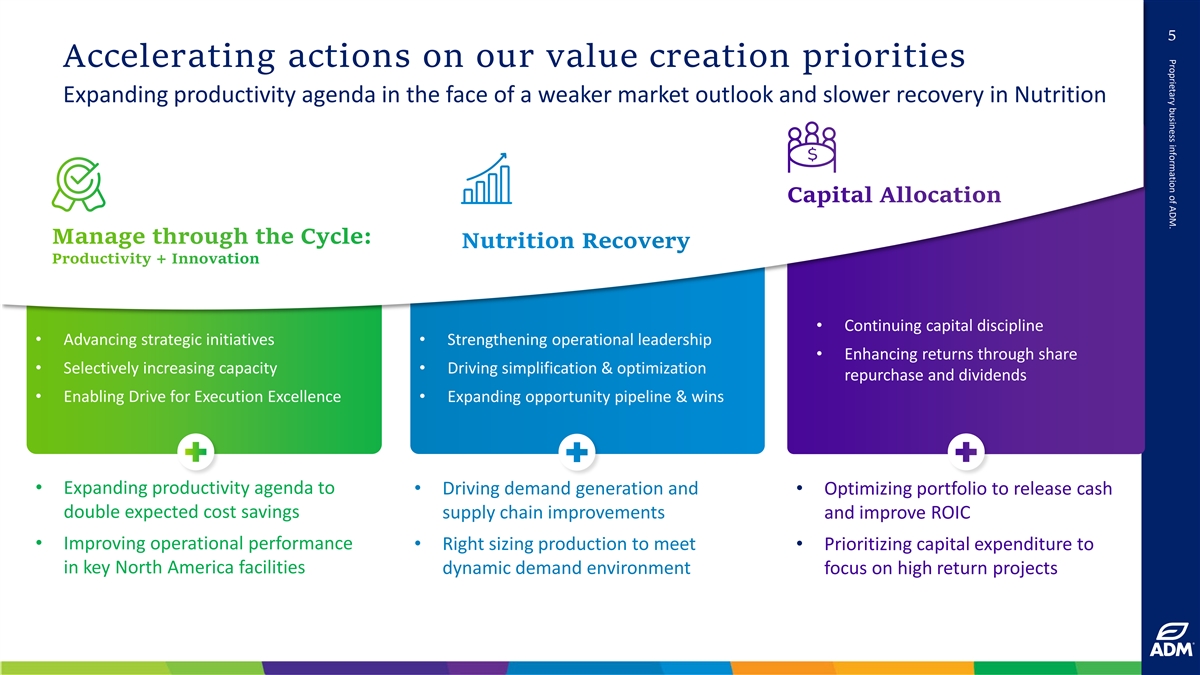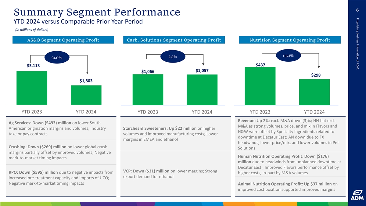 Proprietary business information of ADM. 5 Accelerating actions on our value creation priorities Expanding productivity agenda in the face of a weaker market outlook and slower recovery in Nutrition • Continuing capital discipline • Advancing strategic initiatives • Strengthening operational leadership • Enhancing returns through share • Selectively increasing capacity • Driving simplification & optimization repurchase and dividends • Enabling Drive for Execution Excellence • Expanding opportunity pipeline & wins • Expanding productivity agenda to • Driving demand generation and • Optimizing portfolio to release cash double expected cost savings supply chain improvements and improve ROIC • Improving operational performance • Right sizing production to meet • Prioritizing capital expenditure to in key North America facilities dynamic demand environment focus on high return projects