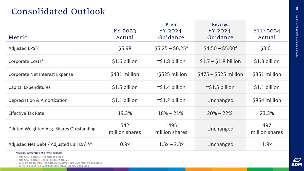 Proprietary business information of ADM. 8 Consolidated Outlook Prior Revised FY 2023 FY 2024 FY 2024 YTD 2024 Metric Actual Guidance Guidance Actual 1,3 4 4 Adjusted EPS $6.98 $5.25 – $6.25 $4.50 – $5.00 $3.61 Corporate Costs* $1.6 billion ~$1.8 billion $1.7 – $1.8 billion $1.3 billion Corporate Net Interest Expense $431 million ~$525 million $475 – $525 million $351 million Capital Expenditures $1.5 billion ~$1.4 billion ~$1.5 billion $1.1 billion Depreciation & Amortization $1.1 billion ~$1.2 billion Unchanged $854 million Effective Tax Rate 19.3% 18% – 21% 20% – 22% 23.3% 542 ~495 497 Diluted Weighted Avg. Shares Outstanding Unchanged million shares million shares million shares 1,2,4 Adjusted Net Debt / Adjusted EBITDA 0.9x 1.5x – 2.0x Unchanged 1.9x *includes corporate net interest expense 1. Non-GAAP measures - see notes on page 3 2. Non-GAAP measure - see calculation on page 25 3. See earnings per share, the most directly comparable GAAP measure, on page 21 4. Forward-looking Non-GAAP financial measure; see note 9 on page 3