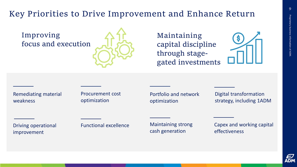 Proprietary business information of ADM. 9 Key Priorities to Drive Improvement and Enhance Return Improving Maintaining focus and execution capital discipline through stage- gated investments Procurement cost Remediating material Portfolio and network Digital transformation optimization strategy, including 1ADM weakness optimization Maintaining strong Capex and working capital Functional excellence Driving operational cash generation effectiveness improvement