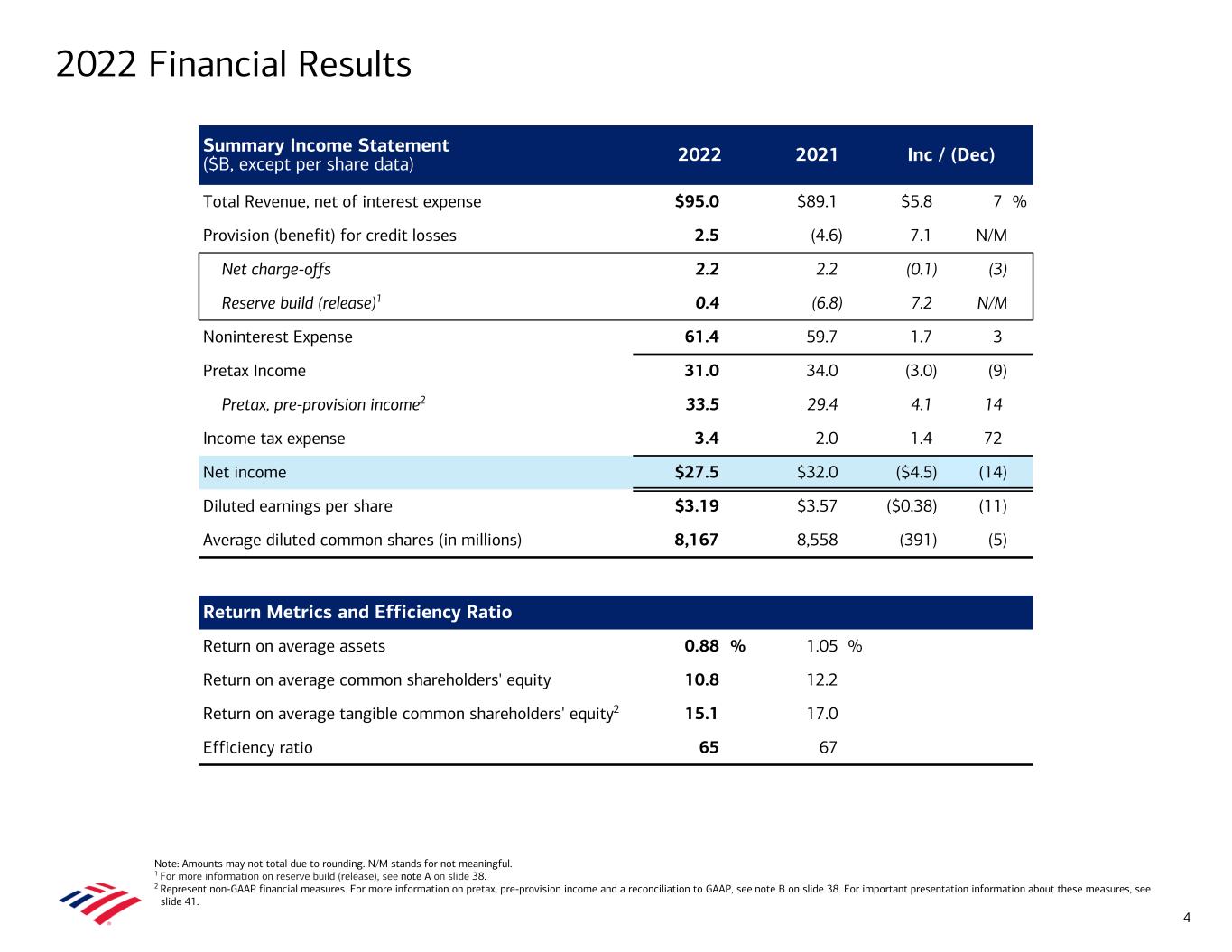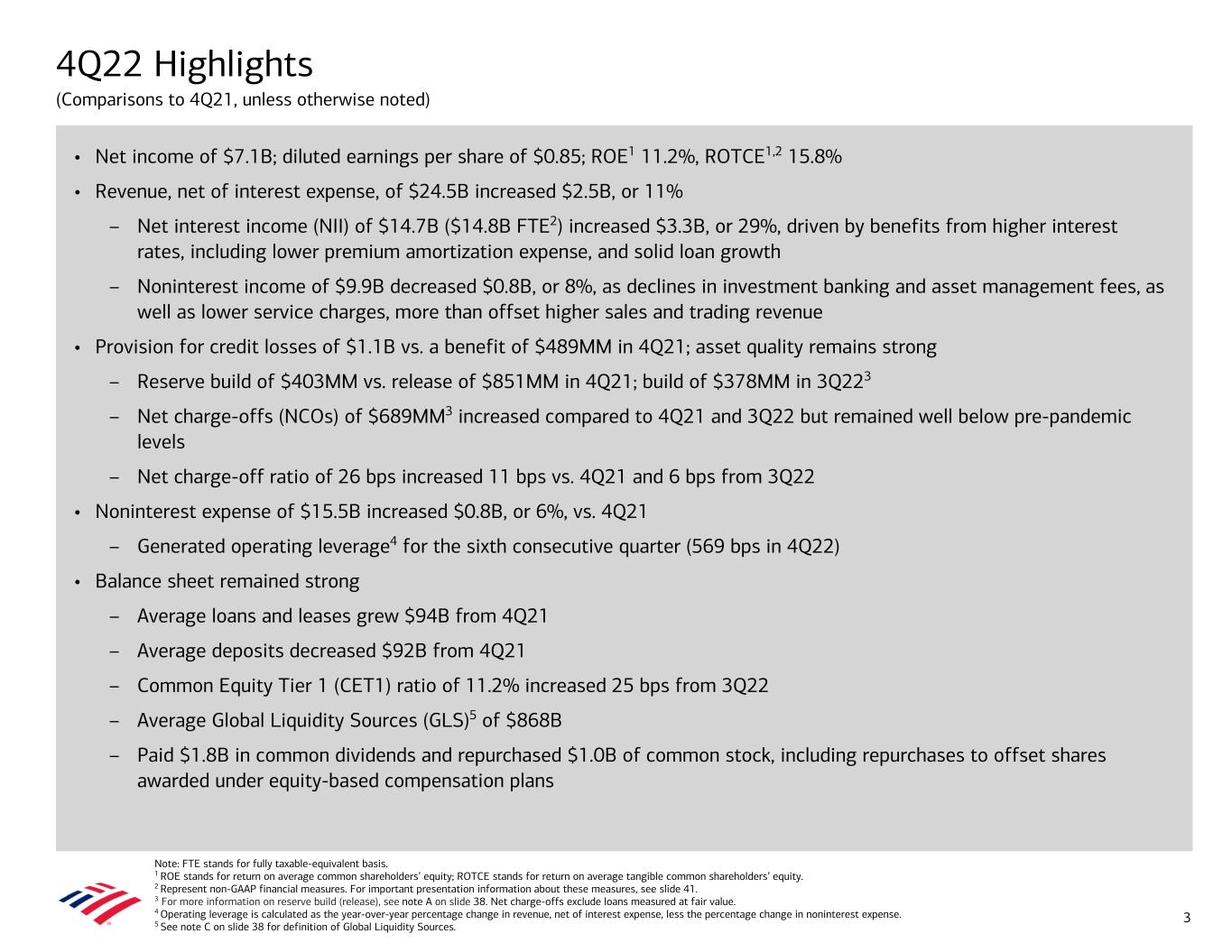4Q22 Highlights (Comparisons to 4Q21, unless otherwise noted) • Net income of $7.1B; diluted earnings per share of $0.85; ROE1 11.2%, ROTCE1,2 15.8% • Revenue, net of interest expense, of $24.5B increased $2.5B, or 11% – Net interest income (NII) of $14.7B ($14.8B FTE2) increased $3.3B, or 29%, driven by benefits from higher interest rates, including lower premium amortization expense, and solid loan growth – Noninterest income of $9.9B decreased $0.8B, or 8%, as declines in investment banking and asset management fees, as well as lower service charges, more than offset higher sales and trading revenue • Provision for credit losses of $1.1B vs. a benefit of $489MM in 4Q21; asset quality remains strong – Reserve build of $403MM vs. release of $851MM in 4Q21; build of $378MM in 3Q223 – Net charge-offs (NCOs) of $689MM3 increased compared to 4Q21 and 3Q22 but remained well below pre-pandemic levels – Net charge-off ratio of 26 bps increased 11 bps vs. 4Q21 and 6 bps from 3Q22 • Noninterest expense of $15.5B increased $0.8B, or 6%, vs. 4Q21 – Generated operating leverage4 for the sixth consecutive quarter (569 bps in 4Q22) • Balance sheet remained strong – Average loans and leases grew $94B from 4Q21 – Average deposits decreased $92B from 4Q21 – Common Equity Tier 1 (CET1) ratio of 11.2% increased 25 bps from 3Q22 – Average Global Liquidity Sources (GLS)5 of $868B – Paid $1.8B in common dividends and repurchased $1.0B of common stock, including repurchases to offset shares awarded under equity-based compensation plans 3 Note: FTE stands for fully taxable-equivalent basis. 1 ROE stands for return on average common shareholders’ equity; ROTCE stands for return on average tangible common shareholders’ equity. 2 Represent non-GAAP financial measures. For important presentation information about these measures, see slide 41. 3 For more information on reserve build (release), see note A on slide 38. Net charge-offs exclude loans measured at fair value. 4 Operating leverage is calculated as the year-over-year percentage change in revenue, net of interest expense, less the percentage change in noninterest expense. 5 See note C on slide 38 for definition of Global Liquidity Sources.