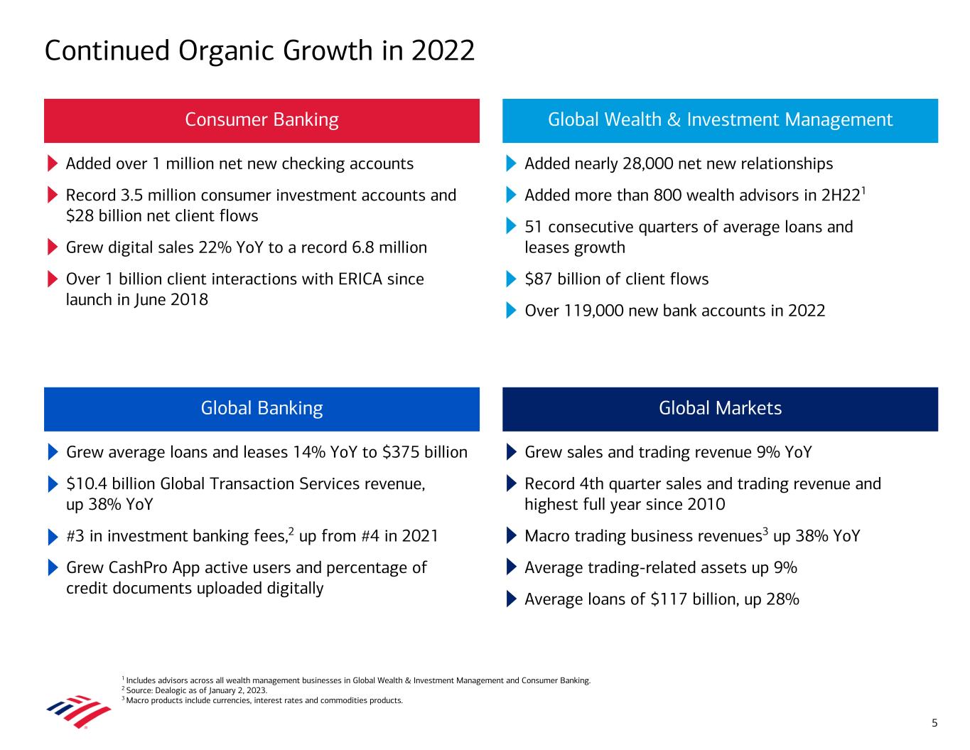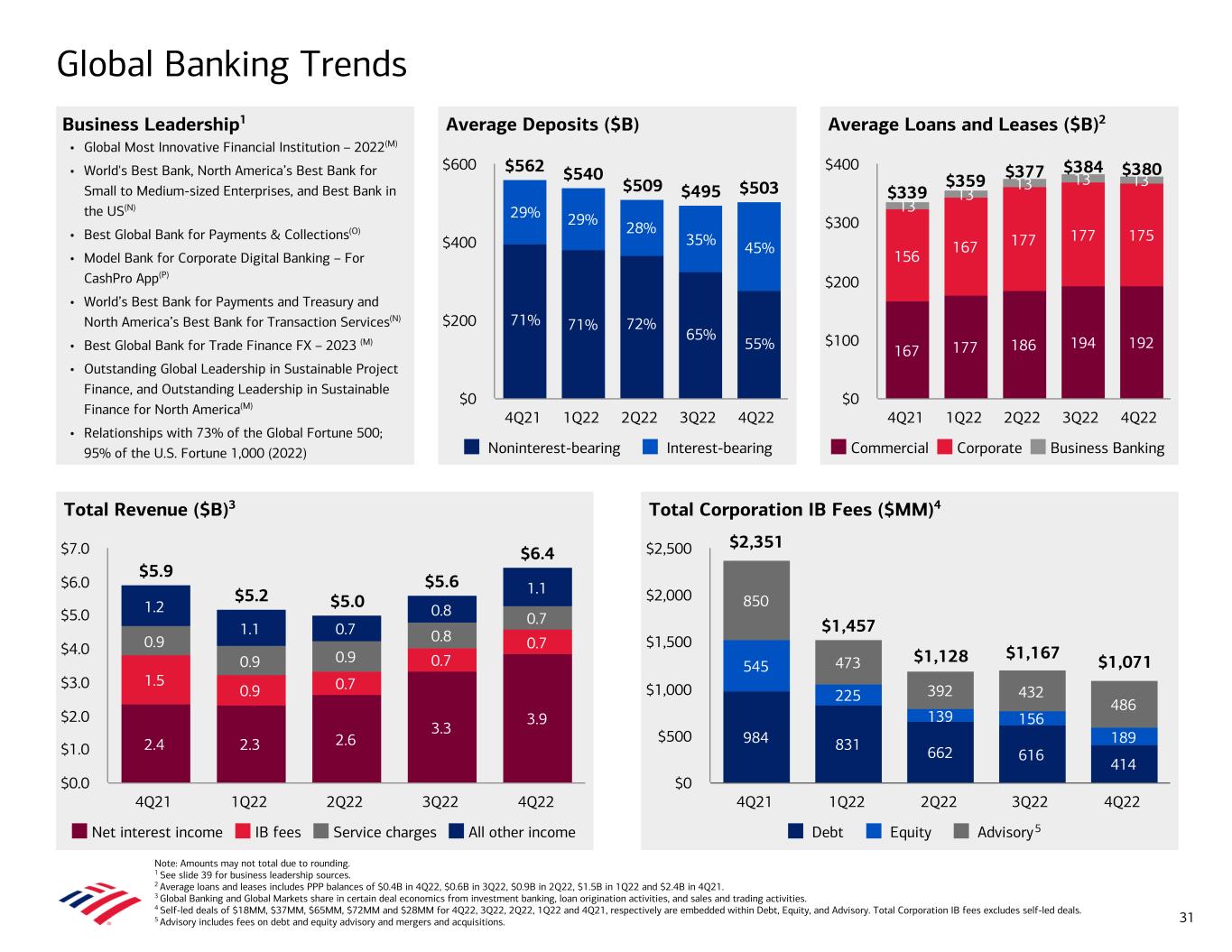 Global Banking Trends Note: Amounts may not total due to rounding. 1 See slide 39 for business leadership sources. 2 Average loans and leases includes PPP balances of $0.4B in 4Q22, $0.6B in 3Q22, $0.9B in 2Q22, $1.5B in 1Q22 and $2.4B in 4Q21. 3 Global Banking and Global Markets share in certain deal economics from investment banking, loan origination activities, and sales and trading activities. 4 Self-led deals of $18MM, $37MM, $65MM, $72MM and $28MM for 4Q22, 3Q22, 2Q22, 1Q22 and 4Q21, respectively are embedded within Debt, Equity, and Advisory. Total Corporation IB fees excludes self-led deals. 5 Advisory includes fees on debt and equity advisory and mergers and acquisitions. Average Deposits ($B)Business Leadership1 • Global Most Innovative Financial Institution – 2022(M) • World's Best Bank, North America’s Best Bank for Small to Medium-sized Enterprises, and Best Bank in the US(N) • Best Global Bank for Payments & Collections(O) • Model Bank for Corporate Digital Banking – For CashPro App(P) • World’s Best Bank for Payments and Treasury and North America’s Best Bank for Transaction Services(N) • Best Global Bank for Trade Finance FX – 2023 (M) • Outstanding Global Leadership in Sustainable Project Finance, and Outstanding Leadership in Sustainable Finance for North America(M) • Relationships with 73% of the Global Fortune 500; 95% of the U.S. Fortune 1,000 (2022) Average Loans and Leases ($B)2 Total Revenue ($B)3 Total Corporation IB Fees ($MM)4 $5.9 $5.2 $5.0 $5.6 $6.4 2.4 2.3 2.6 3.3 3.9 1.5 0.9 0.7 0.7 0.70.9 0.9 0.9 0.8 0.7 1.2 1.1 0.7 0.8 1.1 Net interest income IB fees Service charges All other income 4Q21 1Q22 2Q22 3Q22 4Q22 $0.0 $1.0 $2.0 $3.0 $4.0 $5.0 $6.0 $7.0 984 831 662 616 414 545 225 139 156 189 850 473 392 432 486 $2,351 $1,457 $1,128 $1,167 $1,071 Debt Equity Advisory 4Q21 1Q22 2Q22 3Q22 4Q22 $0 $500 $1,000 $1,500 $2,000 $2,500 167 177 186 194 192 156 167 177 177 175 13 13 13 13 13 $339 $359 $377 $384 $380 Commercial Corporate Business Banking 4Q21 1Q22 2Q22 3Q22 4Q22 $0 $100 $200 $300 $400 5 $562 $540 $509 $495 $503 Noninterest-bearing Interest-bearing 4Q21 1Q22 2Q22 3Q22 4Q22 $0 $200 $400 $600 31 71% 71% 72% 65% 55% 29% 29% 28% 35% 45%