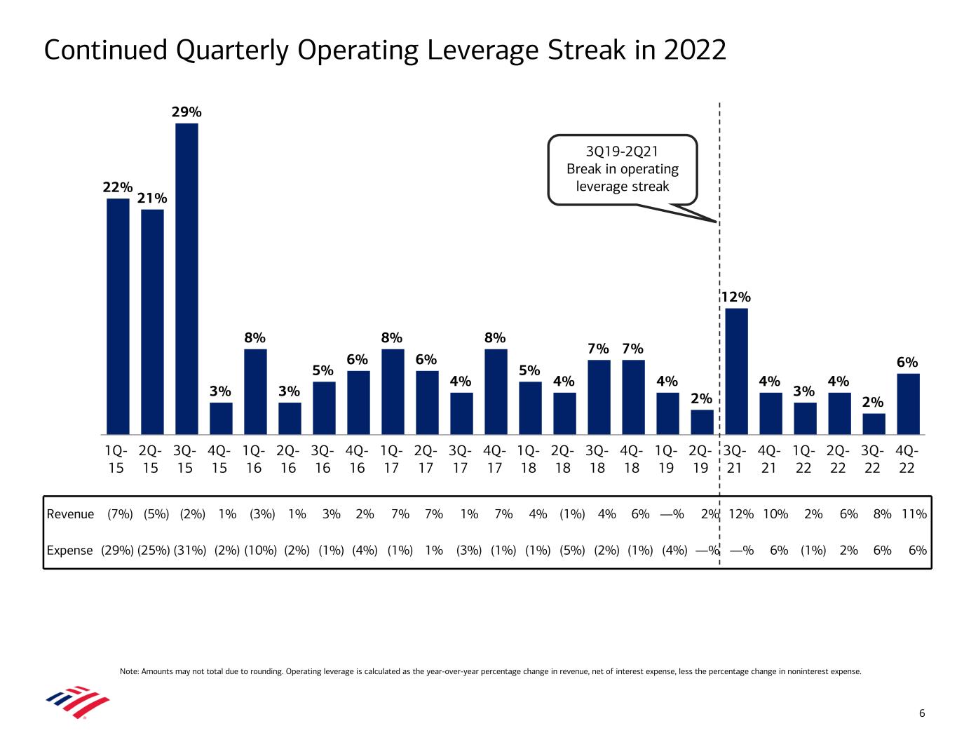 Added nearly 28,000 net new relationships Added more than 800 wealth advisors in 2H221 51 consecutive quarters of average loans and leases growth $87 billion of client flows Over 119,000 new bank accounts in 2022 Continued Organic Growth in 2022 5 Consumer Banking Global Wealth & Investment Management Global Banking Global Markets Added over 1 million net new checking accounts Record 3.5 million consumer investment accounts and $28 billion net client flows Grew digital sales 22% YoY to a record 6.8 million Over 1 billion client interactions with ERICA since launch in June 2018 Grew average loans and leases 14% YoY to $375 billion $10.4 billion Global Transaction Services revenue, up 38% YoY #3 in investment banking fees,2 up from #4 in 2021 Grew CashPro App active users and percentage of credit documents uploaded digitally Grew sales and trading revenue 9% YoY Record 4th quarter sales and trading revenue and highest full year since 2010 Macro trading business revenues3 up 38% YoY Average trading-related assets up 9% Average loans of $117 billion, up 28% 1 Includes advisors across all wealth management businesses in Global Wealth & Investment Management and Consumer Banking. 2 Source: Dealogic as of January 2, 2023. 3 Macro products include currencies, interest rates and commodities products.