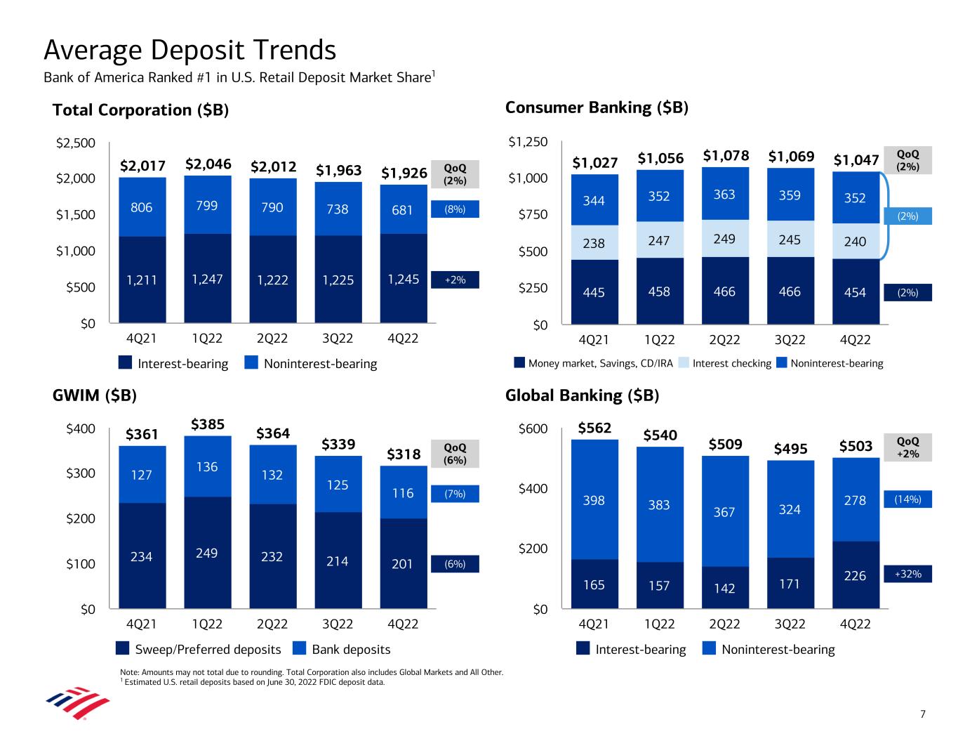 Consumer Banking ($B) GWIM ($B) Global Banking ($B) Total Corporation ($B) Average Deposit Trends Bank of America Ranked #1 in U.S. Retail Deposit Market Share1 Note: Amounts may not total due to rounding. Total Corporation also includes Global Markets and All Other. 1 Estimated U.S. retail deposits based on June 30, 2022 FDIC deposit data. $361 $385 $364 $339 $318 234 249 232 214 201 127 136 132 125 116 Sweep/Preferred deposits Bank deposits 4Q21 1Q22 2Q22 3Q22 4Q22 $0 $100 $200 $300 $400 $2,017 $2,046 $2,012 $1,963 $1,926 1,211 1,247 1,222 1,225 1,245 806 799 790 738 681 Interest-bearing Noninterest-bearing 4Q21 1Q22 2Q22 3Q22 4Q22 $0 $500 $1,000 $1,500 $2,000 $2,500 $562 $540 $509 $495 $503 165 157 142 171 226 398 383 367 324 278 Interest-bearing Noninterest-bearing 4Q21 1Q22 2Q22 3Q22 4Q22 $0 $200 $400 $600 (6%) (7%) +2% (8%) QoQ (2%) QoQ (6%) QoQ (2%) +32% (14%) (2%) QoQ +2% 7 (2%) $1,027 $1,056 $1,078 $1,069 $1,047 445 458 466 466 454 238 247 249 245 240 344 352 363 359 352 Money market, Savings, CD/IRA Interest checking Noninterest-bearing 4Q21 1Q22 2Q22 3Q22 4Q22 $0 $250 $500 $750 $1,000 $1,250