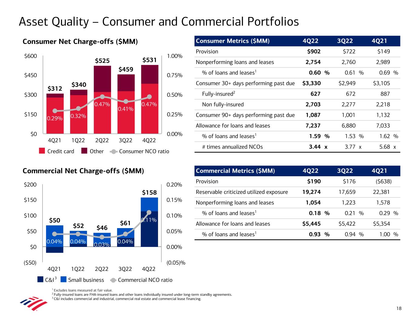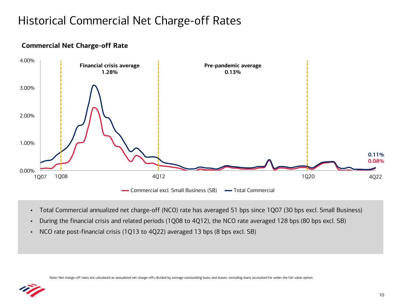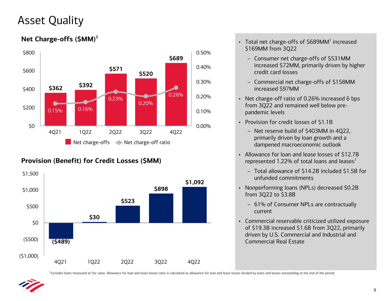 • Total net charge-offs of $689MM1 increased $169MM from 3Q22 – Consumer net charge-offs of $531MM increased $72MM, primarily driven by higher credit card losses – Commercial net charge-offs of $158MM increased $97MM • Net charge-off ratio of 0.26% increased 6 bps from 3Q22 and remained well below pre- pandemic levels • Provision for credit losses of $1.1B – Net reserve build of $403MM in 4Q22, primarily driven by loan growth and a dampened macroeconomic outlook • Allowance for loan and lease losses of $12.7B represented 1.22% of total loans and leases1 – Total allowance of $14.2B included $1.5B for unfunded commitments • Nonperforming loans (NPLs) decreased $0.2B from 3Q22 to $3.8B – 61% of Consumer NPLs are contractually current • Commercial reservable criticized utilized exposure of $19.3B increased $1.6B from 3Q22, primarily driven by U.S. Commercial and Industrial and Commercial Real Estate Asset Quality 1 Excludes loans measured at fair value. Allowance for loan and lease losses ratio is calculated as allowance for loan and lease losses divided by loans and leases outstanding at the end of the period. Provision (Benefit) for Credit Losses ($MM) Net Charge-offs ($MM)1 ($489) $30 $523 $898 $1,092 4Q21 1Q22 2Q22 3Q22 4Q22 ($1,000) ($500) $0 $500 $1,000 $1,500 $362 $392 $571 $520 $689 0.15% 0.16% 0.23% 0.20% 0.26% Net charge-offs Net charge-off ratio 4Q21 1Q22 2Q22 3Q22 4Q22 $0 $200 $400 $600 $800 0.00% 0.10% 0.20% 0.30% 0.40% 0.50% 9