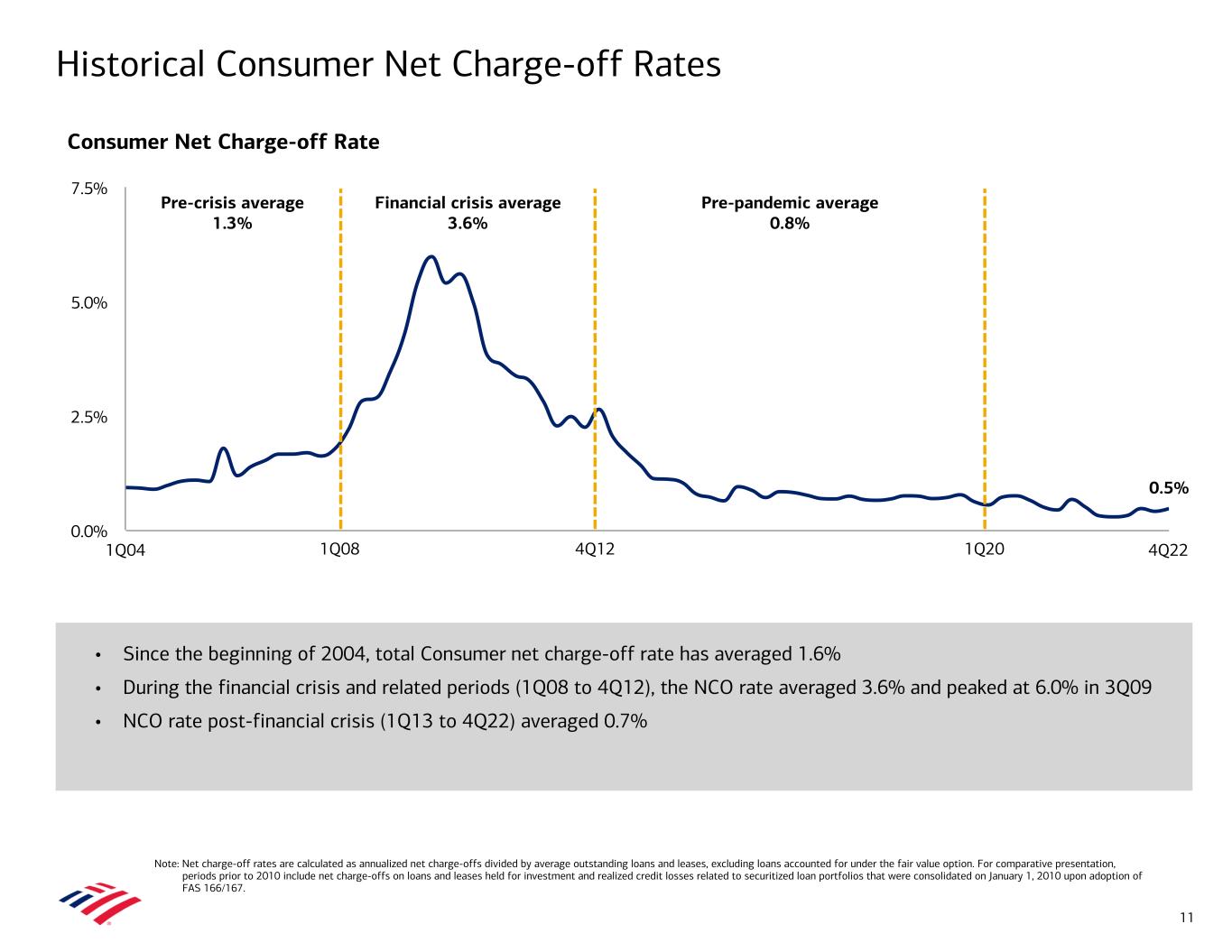 Historical Commercial Net Charge-off Rates 10 Commercial excl. Small Business (SB) Total Commercial 1Q07 4Q22 0.00% 1.00% 2.00% 3.00% 4.00% • Total Commercial annualized net charge-off (NCO) rate has averaged 51 bps since 1Q07 (30 bps excl. Small Business) • During the financial crisis and related periods (1Q08 to 4Q12), the NCO rate averaged 128 bps (80 bps excl. SB) • NCO rate post-financial crisis (1Q13 to 4Q22) averaged 13 bps (8 bps excl. SB) Commercial Net Charge-off Rate Financial crisis average 1.28% Pre-pandemic average 0.13% 0.11% 0.08% 1Q08 4Q12 1Q20 Note: Net charge-off rates are calculated as annualized net charge-offs divided by average outstanding loans and leases, excluding loans accounted for under the fair value option.