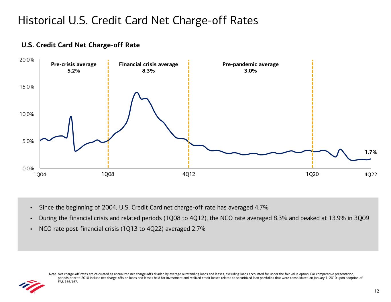 Historical Consumer Net Charge-off Rates 11 • Since the beginning of 2004, total Consumer net charge-off rate has averaged 1.6% • During the financial crisis and related periods (1Q08 to 4Q12), the NCO rate averaged 3.6% and peaked at 6.0% in 3Q09 • NCO rate post-financial crisis (1Q13 to 4Q22) averaged 0.7% Consumer Net Charge-off Rate 0.5% 1Q04 4Q22 0.0% 2.5% 5.0% 7.5% Pre-crisis average 1.3% Financial crisis average 3.6% Pre-pandemic average 0.8% Note: Net charge-off rates are calculated as annualized net charge-offs divided by average outstanding loans and leases, excluding loans accounted for under the fair value option. For comparative presentation, periods prior to 2010 include net charge-offs on loans and leases held for investment and realized credit losses related to securitized loan portfolios that were consolidated on January 1, 2010 upon adoption of FAS 166/167. 1Q08 4Q12 1Q20