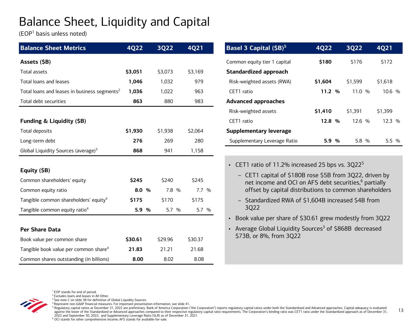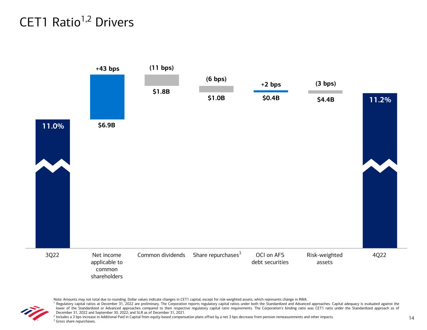 Balance Sheet Metrics 4Q22 3Q22 4Q21 Basel 3 Capital ($B)5 4Q22 3Q22 4Q21 Assets ($B) Common equity tier 1 capital $180 $176 $172 Total assets $3,051 $3,073 $3,169 Standardized approach Total loans and leases 1,046 1,032 979 Risk-weighted assets (RWA) $1,604 $1,599 $1,618 Total loans and leases in business segments2 1,036 1,022 963 CET1 ratio 11.2 % 11.0 % 10.6 % Total debt securities 863 880 983 Advanced approaches Risk-weighted assets $1,410 $1,391 $1,399 Funding & Liquidity ($B) CET1 ratio 12.8 % 12.6 % 12.3 % Total deposits $1,930 $1,938 $2,064 Supplementary leverage Long-term debt 276 269 280 Supplementary Leverage Ratio 5.9 % 5.8 % 5.5 % Global Liquidity Sources (average)3 868 941 1,158 Equity ($B) Common shareholders' equity $245 $240 $245 Common equity ratio 8.0 % 7.8 % 7.7 % Tangible common shareholders' equity4 $175 $170 $175 Tangible common equity ratio4 5.9 % 5.7 % 5.7 % Per Share Data Book value per common share $30.61 $29.96 $30.37 Tangible book value per common share4 21.83 21.21 21.68 Common shares outstanding (in billions) 8.00 8.02 8.08 1 EOP stands for end of period. 2 Excludes loans and leases in All Other. 3 See note C on slide 38 for definition of Global Liquidity Sources. 4 Represent non-GAAP financial measures. For important presentation information, see slide 41. 5 Regulatory capital ratios at December 31, 2022 are preliminary. Bank of America Corporation (“the Corporation”) reports regulatory capital ratios under both the Standardized and Advanced approaches. Capital adequacy is evaluated against the lower of the Standardized or Advanced approaches compared to their respective regulatory capital ratio requirements. The Corporation’s binding ratio was CET1 ratio under the Standardized approach as of December 31, 2022 and September 30, 2022; and Supplementary Leverage Ratio (SLR) as of December 31, 2021. 6 OCI stands for other comprehensive income; AFS stands for available-for-sale. Balance Sheet, Liquidity and Capital (EOP1 basis unless noted) 13 • CET1 ratio of 11.2% increased 25 bps vs. 3Q225 – CET1 capital of $180B rose $5B from 3Q22, driven by net income and OCI on AFS debt securities,6 partially offset by capital distributions to common shareholders – Standardized RWA of $1,604B increased $4B from 3Q22 • Book value per share of $30.61 grew modestly from 3Q22 • Average Global Liquidity Sources3 of $868B decreased $73B, or 8%, from 3Q22