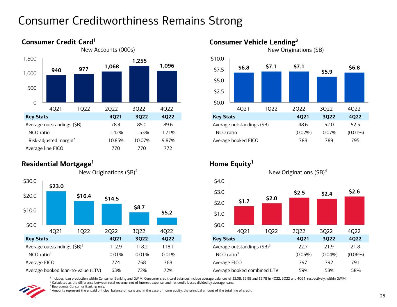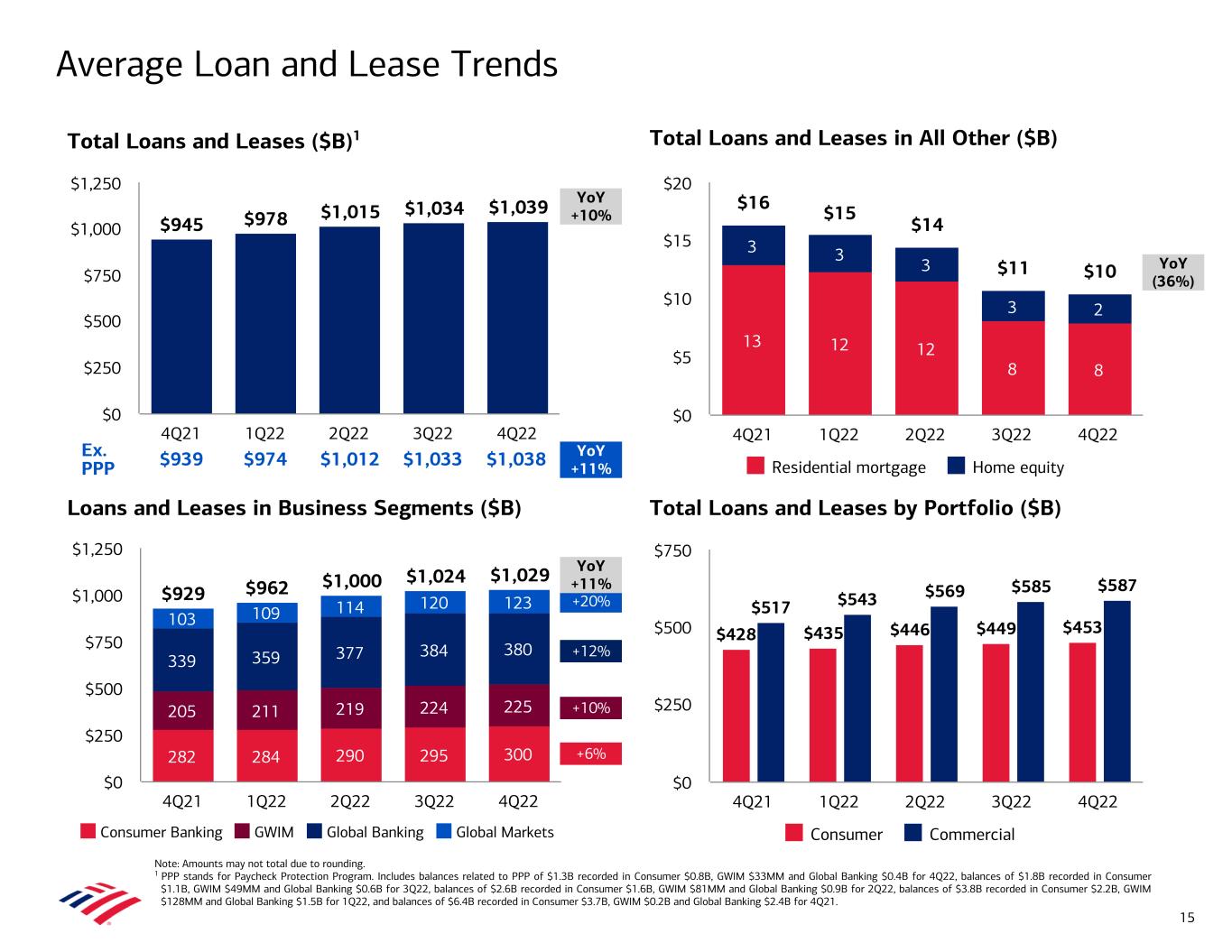 $929 $962 $1,000 $1,024 $1,029 282 284 290 295 300 205 211 219 224 225 339 359 377 384 380 103 109 114 120 123 Consumer Banking GWIM Global Banking Global Markets 4Q21 1Q22 2Q22 3Q22 4Q22 $0 $250 $500 $750 $1,000 $1,250 $945 $978 $1,015 $1,034 $1,039 4Q21 1Q22 2Q22 3Q22 4Q22 $0 $250 $500 $750 $1,000 $1,250 +6% +10% +12% +20% Average Loan and Lease Trends YoY +10% YoY +11% YoY (36%) Note: Amounts may not total due to rounding. 1 PPP stands for Paycheck Protection Program. Includes balances related to PPP of $1.3B recorded in Consumer $0.8B, GWIM $33MM and Global Banking $0.4B for 4Q22, balances of $1.8B recorded in Consumer $1.1B, GWIM $49MM and Global Banking $0.6B for 3Q22, balances of $2.6B recorded in Consumer $1.6B, GWIM $81MM and Global Banking $0.9B for 2Q22, balances of $3.8B recorded in Consumer $2.2B, GWIM $128MM and Global Banking $1.5B for 1Q22, and balances of $6.4B recorded in Consumer $3.7B, GWIM $0.2B and Global Banking $2.4B for 4Q21. Total Loans and Leases in All Other ($B) Loans and Leases in Business Segments ($B) Total Loans and Leases by Portfolio ($B) Total Loans and Leases ($B)1 $428 $435 $446 $449 $453 $517 $543 $569 $585 $587 Consumer Commercial 4Q21 1Q22 2Q22 3Q22 4Q22 $0 $250 $500 $750 15 Ex. PPP $939 $974 $1,012 $1,033 $1,038 13 12 12 8 8 3 3 3 3 2 $16 $15 $14 $11 $10 Residential mortgage Home equity 4Q21 1Q22 2Q22 3Q22 4Q22 $0 $5 $10 $15 $20 YoY +11%