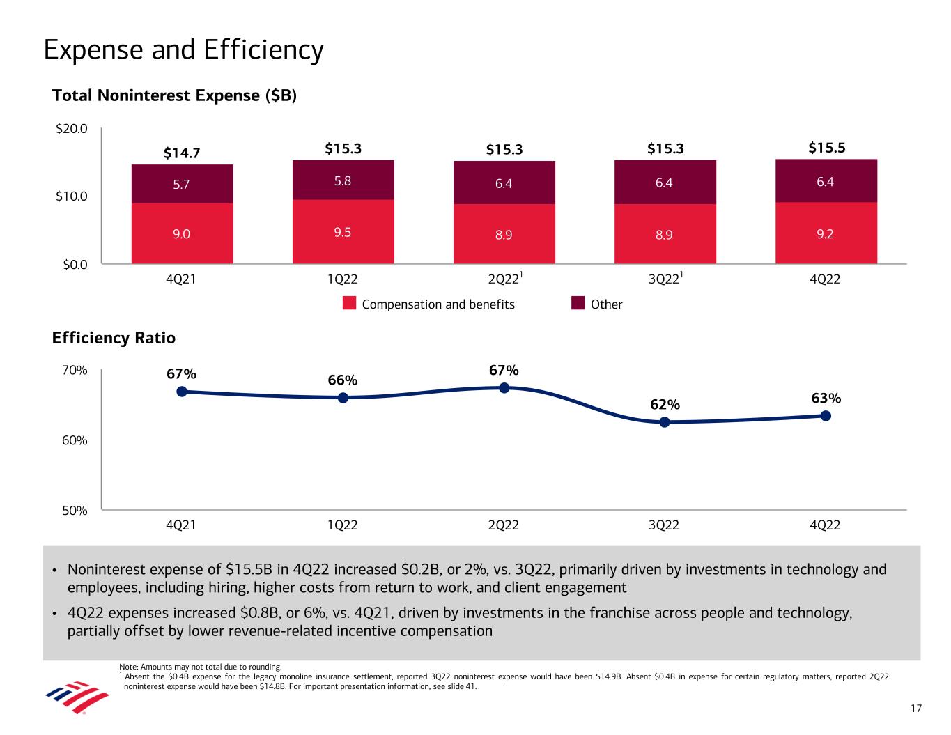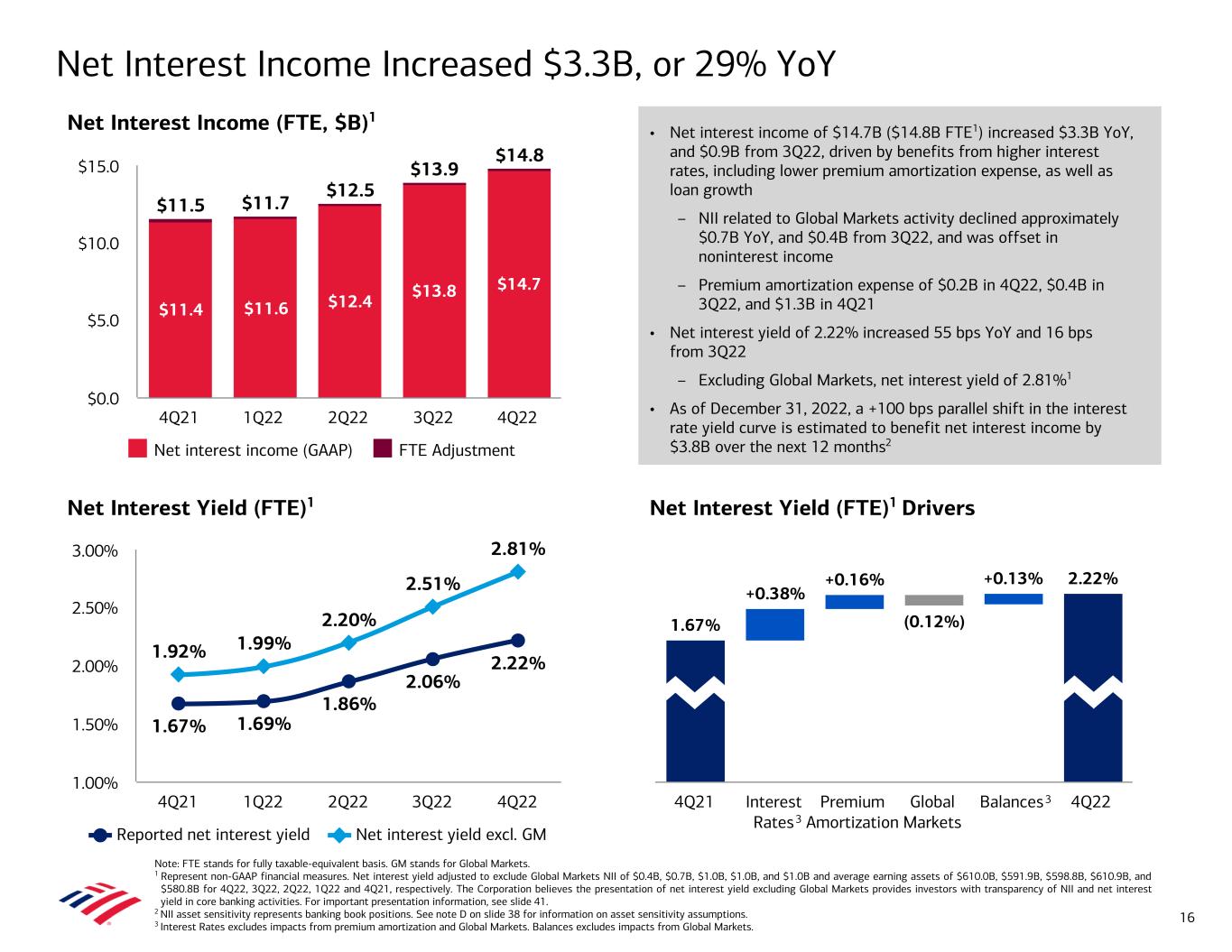 Net Interest Income (FTE, $B)1 • Net interest income of $14.7B ($14.8B FTE1) increased $3.3B YoY, and $0.9B from 3Q22, driven by benefits from higher interest rates, including lower premium amortization expense, as well as loan growth – NII related to Global Markets activity declined approximately $0.7B YoY, and $0.4B from 3Q22, and was offset in noninterest income – Premium amortization expense of $0.2B in 4Q22, $0.4B in 3Q22, and $1.3B in 4Q21 • Net interest yield of 2.22% increased 55 bps YoY and 16 bps from 3Q22 – Excluding Global Markets, net interest yield of 2.81%1 • As of December 31, 2022, a +100 bps parallel shift in the interest rate yield curve is estimated to benefit net interest income by $3.8B over the next 12 months2 Net Interest Income Increased $3.3B, or 29% YoY Net Interest Yield (FTE)1 Note: FTE stands for fully taxable-equivalent basis. GM stands for Global Markets. 1 Represent non-GAAP financial measures. Net interest yield adjusted to exclude Global Markets NII of $0.4B, $0.7B, $1.0B, $1.0B, and $1.0B and average earning assets of $610.0B, $591.9B, $598.8B, $610.9B, and $580.8B for 4Q22, 3Q22, 2Q22, 1Q22 and 4Q21, respectively. The Corporation believes the presentation of net interest yield excluding Global Markets provides investors with transparency of NII and net interest yield in core banking activities. For important presentation information, see slide 41. 2 NII asset sensitivity represents banking book positions. See note D on slide 38 for information on asset sensitivity assumptions. 3 Interest Rates excludes impacts from premium amortization and Global Markets. Balances excludes impacts from Global Markets. 1.67% 1.69% 1.86% 2.06% 2.22% 1.92% 1.99% 2.20% 2.51% 2.81% Reported net interest yield Net interest yield excl. GM 4Q21 1Q22 2Q22 3Q22 4Q22 1.00% 1.50% 2.00% 2.50% 3.00% $11.5 $11.7 $12.5 $13.9 $14.8 $11.4 $11.6 $12.4 $13.8 $14.7 Net interest income (GAAP) FTE Adjustment 4Q21 1Q22 2Q22 3Q22 4Q22 $0.0 $5.0 $10.0 $15.0 16 Net Interest Yield (FTE)1 Drivers 1.67% +0.38% +0.16% (0.12%) +0.13% 2.22% 4Q21 Interest Rates Premium Amortization Global Markets Balances 4Q22 3 3