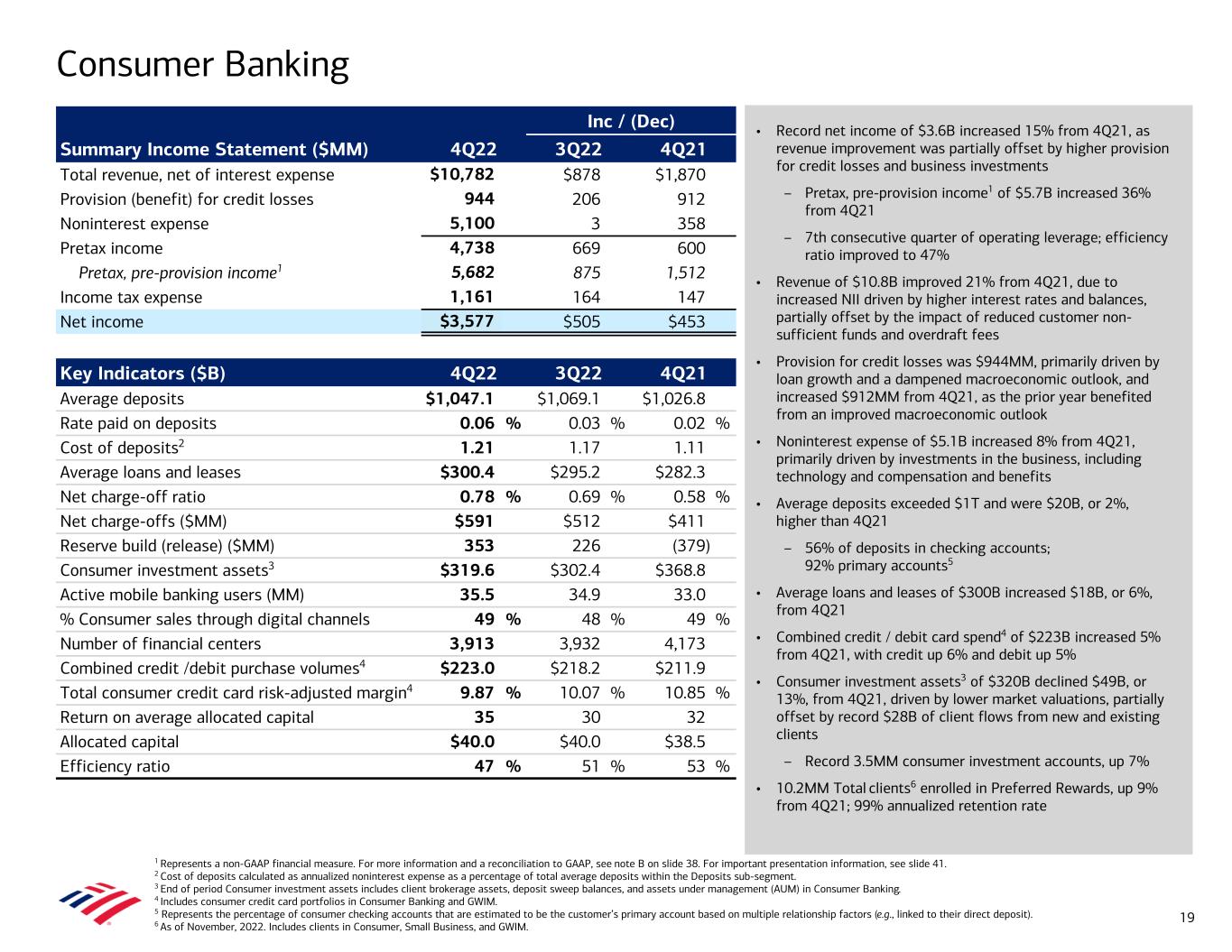 • Record net income of $3.6B increased 15% from 4Q21, as revenue improvement was partially offset by higher provision for credit losses and business investments – Pretax, pre-provision income1 of $5.7B increased 36% from 4Q21 – 7th consecutive quarter of operating leverage; efficiency ratio improved to 47% • Revenue of $10.8B improved 21% from 4Q21, due to increased NII driven by higher interest rates and balances, partially offset by the impact of reduced customer non- sufficient funds and overdraft fees • Provision for credit losses was $944MM, primarily driven by loan growth and a dampened macroeconomic outlook, and increased $912MM from 4Q21, as the prior year benefited from an improved macroeconomic outlook • Noninterest expense of $5.1B increased 8% from 4Q21, primarily driven by investments in the business, including technology and compensation and benefits • Average deposits exceeded $1T and were $20B, or 2%, higher than 4Q21 – 56% of deposits in checking accounts; 92% primary accounts5 • Average loans and leases of $300B increased $18B, or 6%, from 4Q21 • Combined credit / debit card spend4 of $223B increased 5% from 4Q21, with credit up 6% and debit up 5% • Consumer investment assets3 of $320B declined $49B, or 13%, from 4Q21, driven by lower market valuations, partially offset by record $28B of client flows from new and existing clients – Record 3.5MM consumer investment accounts, up 7% • 10.2MM Total clients6 enrolled in Preferred Rewards, up 9% from 4Q21; 99% annualized retention rate Consumer Banking 1 Represents a non-GAAP financial measure. For more information and a reconciliation to GAAP, see note B on slide 38. For important presentation information, see slide 41. 2 Cost of deposits calculated as annualized noninterest expense as a percentage of total average deposits within the Deposits sub-segment. 3 End of period Consumer investment assets includes client brokerage assets, deposit sweep balances, and assets under management (AUM) in Consumer Banking. 4 Includes consumer credit card portfolios in Consumer Banking and GWIM. 5 Represents the percentage of consumer checking accounts that are estimated to be the customer’s primary account based on multiple relationship factors (e.g., linked to their direct deposit). 6 As of November, 2022. Includes clients in Consumer, Small Business, and GWIM. Inc / (Dec) Summary Income Statement ($MM) 4Q22 3Q22 4Q21 Total revenue, net of interest expense $10,782 $878 $1,870 Provision (benefit) for credit losses 944 206 912 Noninterest expense 5,100 3 358 Pretax income 4,738 669 600 Pretax, pre-provision income1 5,682 875 1,512 Income tax expense 1,161 164 147 Net income $3,577 $505 $453 Key Indicators ($B) 4Q22 3Q22 4Q21 Average deposits $1,047.1 $1,069.1 $1,026.8 Rate paid on deposits 0.06 % 0.03 % 0.02 % Cost of deposits2 1.21 1.17 1.11 Average loans and leases $300.4 $295.2 $282.3 Net charge-off ratio 0.78 % 0.69 % 0.58 % Net charge-offs ($MM) $591 $512 $411 Reserve build (release) ($MM) 353 226 (379) Consumer investment assets3 $319.6 $302.4 $368.8 Active mobile banking users (MM) 35.5 34.9 33.0 % Consumer sales through digital channels 49 % 48 % 49 % Number of financial centers 3,913 3,932 4,173 Combined credit /debit purchase volumes4 $223.0 $218.2 $211.9 Total consumer credit card risk-adjusted margin4 9.87 % 10.07 % 10.85 % Return on average allocated capital 35 30 32 Allocated capital $40.0 $40.0 $38.5 Efficiency ratio 47 % 51 % 53 % 19