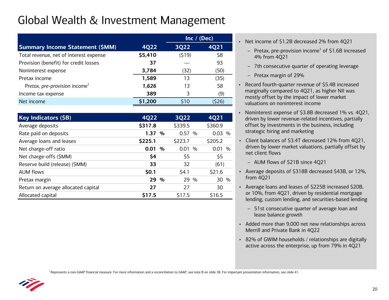 • Net income of $1.2B decreased 2% from 4Q21 – Pretax, pre-provision income1 of $1.6B increased 4% from 4Q21 – 7th consecutive quarter of operating leverage – Pretax margin of 29% • Record fourth-quarter revenue of $5.4B increased marginally compared to 4Q21, as higher NII was mostly offset by the impact of lower market valuations on noninterest income • Noninterest expense of $3.8B decreased 1% vs. 4Q21, driven by lower revenue-related incentives, partially offset by investments in the business, including strategic hiring and marketing • Client balances of $3.4T decreased 12% from 4Q21, driven by lower market valuations, partially offset by net client flows – AUM flows of $21B since 4Q21 • Average deposits of $318B decreased $43B, or 12%, from 4Q21 • Average loans and leases of $225B increased $20B, or 10%, from 4Q21, driven by residential mortgage lending, custom lending, and securities-based lending – 51st consecutive quarter of average loan and lease balance growth • Added more than 9,000 net new relationships across Merrill and Private Bank in 4Q22 • 82% of GWIM households / relationships are digitally active across the enterprise, up from 79% in 4Q21 Global Wealth & Investment Management 1 Represents a non-GAAP financial measure. For more information and a reconciliation to GAAP, see note B on slide 38. For important presentation information, see slide 41. Inc / (Dec) Summary Income Statement ($MM) 4Q22 3Q22 4Q21 Total revenue, net of interest expense $5,410 ($19) $8 Provision (benefit) for credit losses 37 — 93 Noninterest expense 3,784 (32) (50) Pretax income 1,589 13 (35) Pretax, pre-provision income1 1,626 13 58 Income tax expense 389 3 (9) Net income $1,200 $10 ($26) Key Indicators ($B) 4Q22 3Q22 4Q21 Average deposits $317.8 $339.5 $360.9 Rate paid on deposits 1.37 % 0.57 % 0.03 % Average loans and leases $225.1 $223.7 $205.2 Net charge-off ratio 0.01 % 0.01 % 0.01 % Net charge-offs ($MM) $4 $5 $5 Reserve build (release) ($MM) 33 32 (61) AUM flows $0.1 $4.1 $21.6 Pretax margin 29 % 29 % 30 % Return on average allocated capital 27 27 30 Allocated capital $17.5 $17.5 $16.5 20
