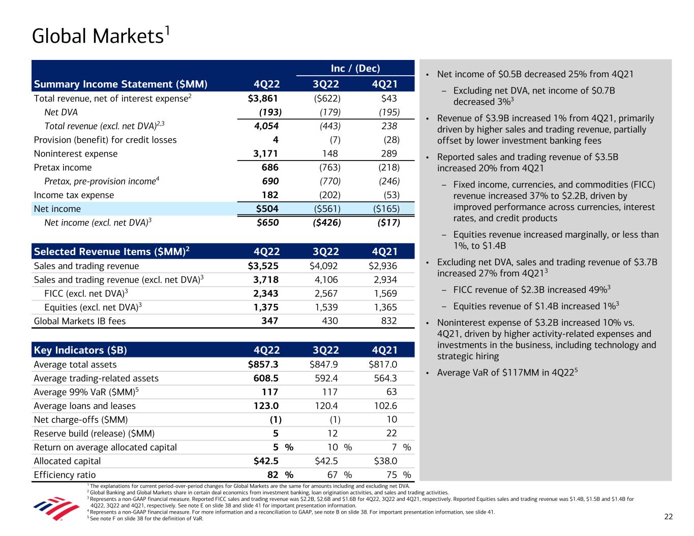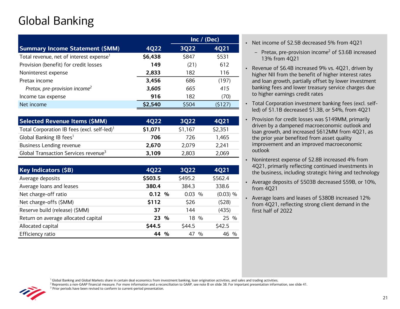 • Net income of $2.5B decreased 5% from 4Q21 – Pretax, pre-provision income2 of $3.6B increased 13% from 4Q21 • Revenue of $6.4B increased 9% vs. 4Q21, driven by higher NII from the benefit of higher interest rates and loan growth, partially offset by lower investment banking fees and lower treasury service charges due to higher earnings credit rates • Total Corporation investment banking fees (excl. self- led) of $1.1B decreased $1.3B, or 54%, from 4Q21 • Provision for credit losses was $149MM, primarily driven by a dampened macroeconomic outlook and loan growth, and increased $612MM from 4Q21, as the prior year benefited from asset quality improvement and an improved macroeconomic outlook • Noninterest expense of $2.8B increased 4% from 4Q21, primarily reflecting continued investments in the business, including strategic hiring and technology • Average deposits of $503B decreased $59B, or 10%, from 4Q21 • Average loans and leases of $380B increased 12% from 4Q21, reflecting strong client demand in the first half of 2022 Global Banking 1 Global Banking and Global Markets share in certain deal economics from investment banking, loan origination activities, and sales and trading activities. 2 Represents a non-GAAP financial measure. For more information and a reconciliation to GAAP, see note B on slide 38. For important presentation information, see slide 41. 3 Prior periods have been revised to conform to current-period presentation. Inc / (Dec) Summary Income Statement ($MM) 4Q22 3Q22 4Q21 Total revenue, net of interest expense1 $6,438 $847 $531 Provision (benefit) for credit losses 149 (21) 612 Noninterest expense 2,833 182 116 Pretax income 3,456 686 (197) Pretax, pre-provision income2 3,605 665 415 Income tax expense 916 182 (70) Net income $2,540 $504 ($127) Selected Revenue Items ($MM) 4Q22 3Q22 4Q21 Total Corporation IB fees (excl. self-led)1 $1,071 $1,167 $2,351 Global Banking IB fees1 706 726 1,465 Business Lending revenue 2,670 2,079 2,241 Global Transaction Services revenue3 3,109 2,803 2,069 Key Indicators ($B) 4Q22 3Q22 4Q21 Average deposits $503.5 $495.2 $562.4 Average loans and leases 380.4 384.3 338.6 Net charge-off ratio 0.12 % 0.03 % (0.03) % Net charge-offs ($MM) $112 $26 ($28) Reserve build (release) ($MM) 37 144 (435) Return on average allocated capital 23 % 18 % 25 % Allocated capital $44.5 $44.5 $42.5 Efficiency ratio 44 % 47 % 46 % 21