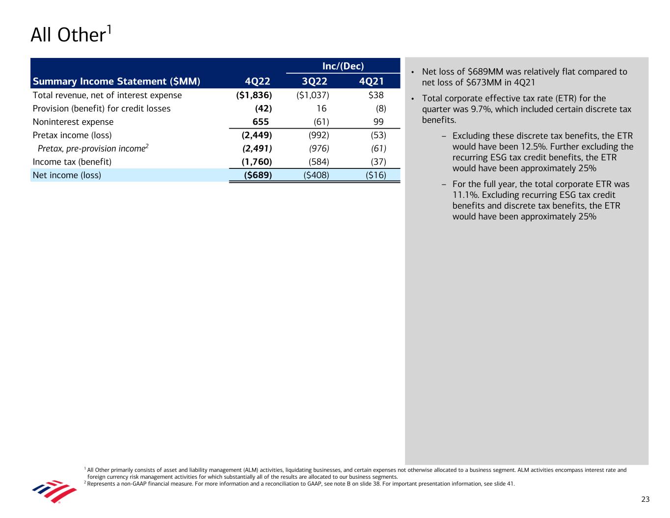All Other1 • Net loss of $689MM was relatively flat compared to net loss of $673MM in 4Q21 • Total corporate effective tax rate (ETR) for the quarter was 9.7%, which included certain discrete tax benefits. – Excluding these discrete tax benefits, the ETR would have been 12.5%. Further excluding the recurring ESG tax credit benefits, the ETR would have been approximately 25% – For the full year, the total corporate ETR was 11.1%. Excluding recurring ESG tax credit benefits and discrete tax benefits, the ETR would have been approximately 25% 1 All Other primarily consists of asset and liability management (ALM) activities, liquidating businesses, and certain expenses not otherwise allocated to a business segment. ALM activities encompass interest rate and foreign currency risk management activities for which substantially all of the results are allocated to our business segments. 2 Represents a non-GAAP financial measure. For more information and a reconciliation to GAAP, see note B on slide 38. For important presentation information, see slide 41. Inc/(Dec) Summary Income Statement ($MM) 4Q22 3Q22 4Q21 Total revenue, net of interest expense ($1,836) ($1,037) $38 Provision (benefit) for credit losses (42) 16 (8) Noninterest expense 655 (61) 99 Pretax income (loss) (2,449) (992) (53) Pretax, pre-provision income2 (2,491) (976) (61) Income tax (benefit) (1,760) (584) (37) Net income (loss) ($689) ($408) ($16) 23