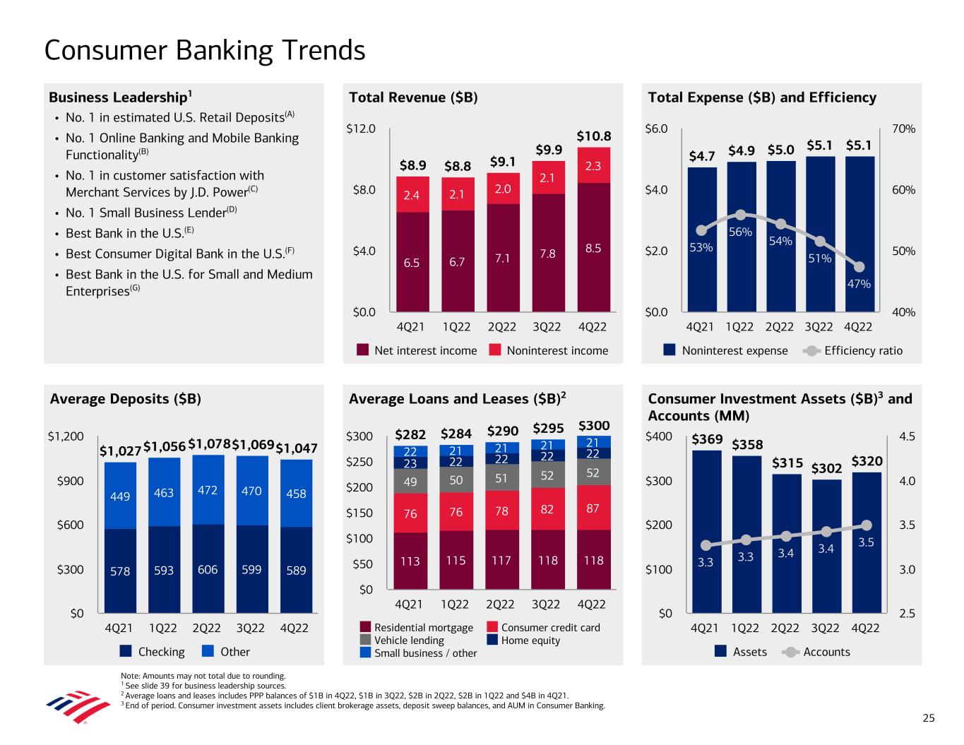 Total Expense ($B) and Efficiency Business Leadership1 • No. 1 in estimated U.S. Retail Deposits(A) • No. 1 Online Banking and Mobile Banking Functionality(B) • No. 1 in customer satisfaction with Merchant Services by J.D. Power(C) • No. 1 Small Business Lender(D) • Best Bank in the U.S.(E) • Best Consumer Digital Bank in the U.S.(F) • Best Bank in the U.S. for Small and Medium Enterprises(G) Total Revenue ($B) Average Deposits ($B) Consumer Investment Assets ($B)3 and Accounts (MM) Average Loans and Leases ($B)2 Consumer Banking Trends Note: Amounts may not total due to rounding. 1 See slide 39 for business leadership sources. 2 Average loans and leases includes PPP balances of $1B in 4Q22, $1B in 3Q22, $2B in 2Q22, $2B in 1Q22 and $4B in 4Q21. 3 End of period. Consumer investment assets includes client brokerage assets, deposit sweep balances, and AUM in Consumer Banking. $8.9 $8.8 $9.1 $9.9 $10.8 6.5 6.7 7.1 7.8 8.5 2.4 2.1 2.0 2.1 2.3 Net interest income Noninterest income 4Q21 1Q22 2Q22 3Q22 4Q22 $0.0 $4.0 $8.0 $12.0 $4.7 $4.9 $5.0 $5.1 $5.1 53% 56% 54% 51% 47% Noninterest expense Efficiency ratio 4Q21 1Q22 2Q22 3Q22 4Q22 $0.0 $2.0 $4.0 $6.0 40% 50% 60% 70% $1,027$1,056$1,078$1,069$1,047 578 593 606 599 589 449 463 472 470 458 Checking Other 4Q21 1Q22 2Q22 3Q22 4Q22 $0 $300 $600 $900 $1,200 $282 $284 $290 $295 $300 113 115 117 118 118 76 76 78 82 87 49 50 51 52 52 23 22 22 22 2222 21 21 21 21 Residential mortgage Consumer credit card Vehicle lending Home equity Small business / other 4Q21 1Q22 2Q22 3Q22 4Q22 $0 $50 $100 $150 $200 $250 $300 25 $369 $358 $315 $302 $320 3.3 3.3 3.4 3.4 3.5 Assets Accounts 4Q21 1Q22 2Q22 3Q22 4Q22 $0 $100 $200 $300 $400 2.5 3.0 3.5 4.0 4.5