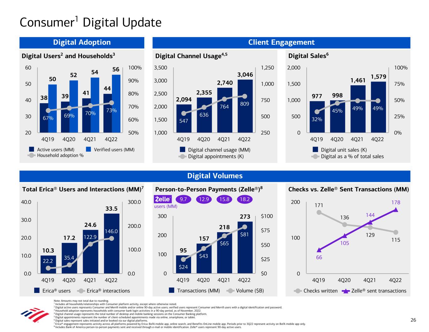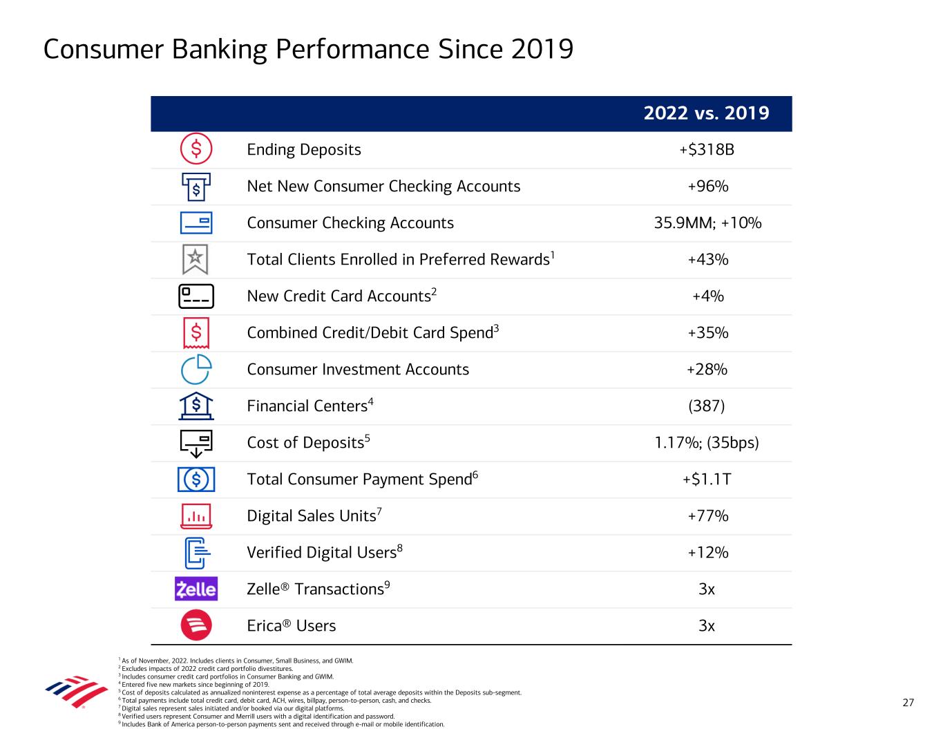 Total Erica® Users and Interactions (MM)7 Checks vs. Zelle® Sent Transactions (MM) Digital Sales6Digital Users2 and Households3 Digital Channel Usage4,5 977 998 1,461 1,579 32% 45% 49% 49% Digital unit sales (K) Digital as a % of total sales 4Q19 4Q20 4Q21 4Q22 0 500 1,000 1,500 2,000 0% 25% 50% 75% 100% 2,094 2,355 2,740 3,046 547 636 764 809 Digital channel usage (MM) Digital appointments (K) 4Q19 4Q20 4Q21 4Q22 1,000 1,500 2,000 2,500 3,000 3,500 250 500 750 1,000 1,250 38 39 41 44 50 52 54 56 67% 69% 70% 73% Active users (MM) Verified users (MM) Household adoption % 4Q19 4Q20 4Q21 4Q22 20 30 40 50 60 50% 60% 70% 80% 90% 100% Client Engagement Person-to-Person Payments (Zelle®)8 Digital Volumes 95 157 218 273 $24 $43 $65 $81 Transactions (MM) Volume ($B) 4Q19 4Q20 4Q21 4Q22 0 100 200 300 $0 $25 $50 $75 $100 Consumer1 Digital Update Note: Amounts may not total due to rounding. 1 Includes all households/relationships with Consumer platform activity, except where otherwise noted. 2 Digital active users represents Consumer and Merrill mobile and/or online 90-day active users; verified users represent Consumer and Merrill users with a digital identification and password. 3 Household adoption represents households with consumer bank login activities in a 90-day period, as of November, 2022. 4 Digital channel usage represents the total number of desktop and mobile banking sessions on the Consumer Banking platform. 5 Digital appointments represent the number of client-scheduled appointments made via online, smartphone, or tablet. 6 Digital sales represent sales initiated and/or booked via our digital platforms. 7 Erica® engagement represents activity across all platforms powered by Erica: BofA mobile app, online search, and Benefits OnLine mobile app. Periods prior to 3Q22 represent activity on BofA mobile app only. 8 Includes Bank of America person-to-person payments sent and received through e-mail or mobile identification. Zelle® users represent 90-day active users. 9.7 12.9 15.8 18.2 users (MM) 26 Digital Adoption 171 136 129 115 66 105 144 178 Checks written Zelle® sent transactions 4Q19 4Q20 4Q21 4Q22 0 100 200 10.3 17.2 24.6 33.5 22.2 35.4 122.9 146.0 Erica® users Erica® interactions 4Q19 4Q20 4Q21 4Q22 0.0 10.0 20.0 30.0 40.0 0.0 100.0 200.0 300.0