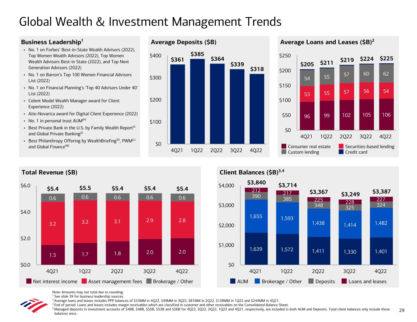 Average Deposits ($B) Global Wealth & Investment Management Trends Business Leadership1 • No. 1 on Forbes’ Best-in-State Wealth Advisors (2022), Top Women Wealth Advisors (2022), Top Women Wealth Advisors Best-in State (2022), and Top Next Generation Advisors (2022) • No. 1 on Barron’s Top 100 Women Financial Advisors List (2022) • No. 1 on Financial Planning's 'Top 40 Advisors Under 40' List (2022) • Celent Model Wealth Manager award for Client Experience (2022) • Aite-Novarica award for Digital Client Experience (2022) • No. 1 in personal trust AUM(H) • Best Private Bank in the U.S. by Family Wealth Report(I) and Global Private Banking(J) • Best Philanthropy Offering by WealthBriefing(K), PWM(L) and Global Finance(M) Note: Amounts may not total due to rounding. 1 See slide 39 for business leadership sources. 2 Average loans and leases includes PPP balances of $33MM in 4Q22, $49MM in 3Q22, $81MM in 2Q22, $128MM in 1Q22 and $244MM in 4Q21. 3 End of period. Loans and leases includes margin receivables which are classified in customer and other receivables on the Consolidated Balance Sheet. 4 Managed deposits in investment accounts of $48B, $48B, $55B, $53B and $56B for 4Q22, 3Q22, 2Q22, 1Q22 and 4Q21, respectively, are included in both AUM and Deposits. Total client balances only include these balances once. Average Loans and Leases ($B)2 Total Revenue ($B) Client Balances ($B)3,4 $5.4 $5.5 $5.4 $5.4 $5.4 1.5 1.7 1.8 2.0 2.0 3.2 3.2 3.1 2.9 2.8 0.6 0.6 0.6 0.6 0.6 Net interest income Asset management fees Brokerage / Other 4Q21 1Q22 2Q22 3Q22 4Q22 $0.0 $2.0 $4.0 $6.0 1,639 1,572 1,411 1,330 1,401 1,655 1,593 1,438 1,414 1,482 390 385 348 325 324 212 217 225 228 227 $3,840 $3,714 $3,367 $3,249 $3,387 AUM Brokerage / Other Deposits Loans and leases 4Q21 1Q22 2Q22 3Q22 4Q22 $0 $1,000 $2,000 $3,000 $4,000 $205 $211 $219 $224 $225 96 99 102 105 106 53 55 57 56 54 54 55 57 60 62 Consumer real estate Securities-based lending Custom lending Credit card 4Q21 1Q22 2Q22 3Q22 4Q22 $0 $50 $100 $150 $200 $250 $361 $385 $364 $339 $318 4Q21 1Q22 2Q22 3Q22 4Q22 $0 $100 $200 $300 $400 29
