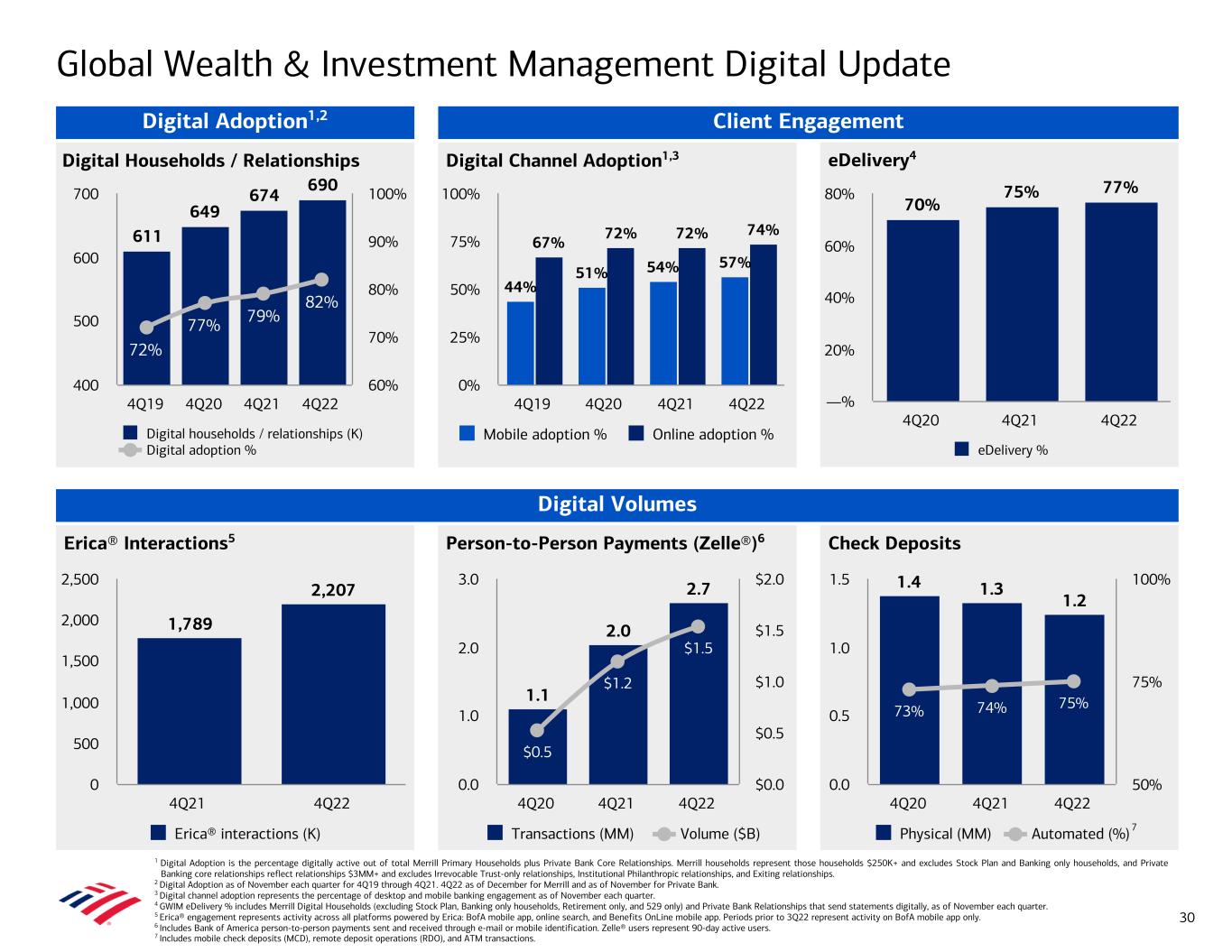 Person-to-Person Payments (Zelle®)6Erica® Interactions5 Check Deposits eDelivery4Digital Households / Relationships Digital Channel Adoption1,3 70% 75% 77% eDelivery % 4Q20 4Q21 4Q22 —% 20% 40% 60% 80% 44% 51% 54% 57% 67% 72% 72% 74% Mobile adoption % Online adoption % 4Q19 4Q20 4Q21 4Q22 0% 25% 50% 75% 100% 611 649 674 690 72% 77% 79% 82% Digital households / relationships (K) Digital adoption % 4Q19 4Q20 4Q21 4Q22 400 500 600 700 60% 70% 80% 90% 100% Client Engagement Digital Volumes Global Wealth & Investment Management Digital Update 1 Digital Adoption is the percentage digitally active out of total Merrill Primary Households plus Private Bank Core Relationships. Merrill households represent those households $250K+ and excludes Stock Plan and Banking only households, and Private Banking core relationships reflect relationships $3MM+ and excludes Irrevocable Trust-only relationships, Institutional Philanthropic relationships, and Exiting relationships. 2 Digital Adoption as of November each quarter for 4Q19 through 4Q21. 4Q22 as of December for Merrill and as of November for Private Bank. 3 Digital channel adoption represents the percentage of desktop and mobile banking engagement as of November each quarter. 4 GWIM eDelivery % includes Merrill Digital Households (excluding Stock Plan, Banking only households, Retirement only, and 529 only) and Private Bank Relationships that send statements digitally, as of November each quarter. 5 Erica® engagement represents activity across all platforms powered by Erica: BofA mobile app, online search, and Benefits OnLine mobile app. Periods prior to 3Q22 represent activity on BofA mobile app only. 6 Includes Bank of America person-to-person payments sent and received through e-mail or mobile identification. Zelle® users represent 90-day active users. 7 Includes mobile check deposits (MCD), remote deposit operations (RDO), and ATM transactions. 30 Digital Adoption1,2 1,789 2,207 Erica® interactions (K) 4Q21 4Q22 0 500 1,000 1,500 2,000 2,500 1.1 2.0 2.7 $0.5 $1.2 $1.5 Transactions (MM) Volume ($B) 4Q20 4Q21 4Q22 0.0 1.0 2.0 3.0 $0.0 $0.5 $1.0 $1.5 $2.0 1.4 1.3 1.2 73% 74% 75% Physical (MM) Automated (%) 4Q20 4Q21 4Q22 0.0 0.5 1.0 1.5 50% 75% 100% 7