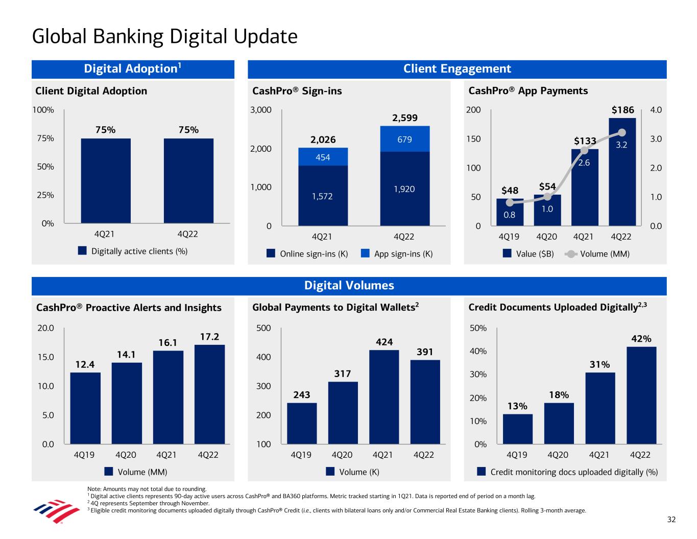 Credit Documents Uploaded Digitally2,3 CashPro® Proactive Alerts and Insights Global Payments to Digital Wallets2 CashPro® App PaymentsClient Digital Adoption CashPro® Sign-ins $48 $54 $133 $186 0.8 1.0 2.6 3.2 Value ($B) Volume (MM) 4Q19 4Q20 4Q21 4Q22 0 50 100 150 200 0.0 1.0 2.0 3.0 4.0 2,026 2,599 1,572 1,920 454 679 Online sign-ins (K) App sign-ins (K) 4Q21 4Q22 0 1,000 2,000 3,000 75% 75% Digitally active clients (%) 4Q21 4Q22 0% 25% 50% 75% 100% Client Engagement Digital Volumes Global Banking Digital Update 32 Digital Adoption1 Note: Amounts may not total due to rounding. 1 Digital active clients represents 90-day active users across CashPro® and BA360 platforms. Metric tracked starting in 1Q21. Data is reported end of period on a month lag. 2 4Q represents September through November. 3 Eligible credit monitoring documents uploaded digitally through CashPro® Credit (i.e., clients with bilateral loans only and/or Commercial Real Estate Banking clients). Rolling 3-month average. 243 317 424 391 Volume (K) 4Q19 4Q20 4Q21 4Q22 100 200 300 400 500 12.4 14.1 16.1 17.2 Volume (MM) 4Q19 4Q20 4Q21 4Q22 0.0 5.0 10.0 15.0 20.0 13% 18% 31% 42% Credit monitoring docs uploaded digitally (%) 4Q19 4Q20 4Q21 4Q22 0% 10% 20% 30% 40% 50%