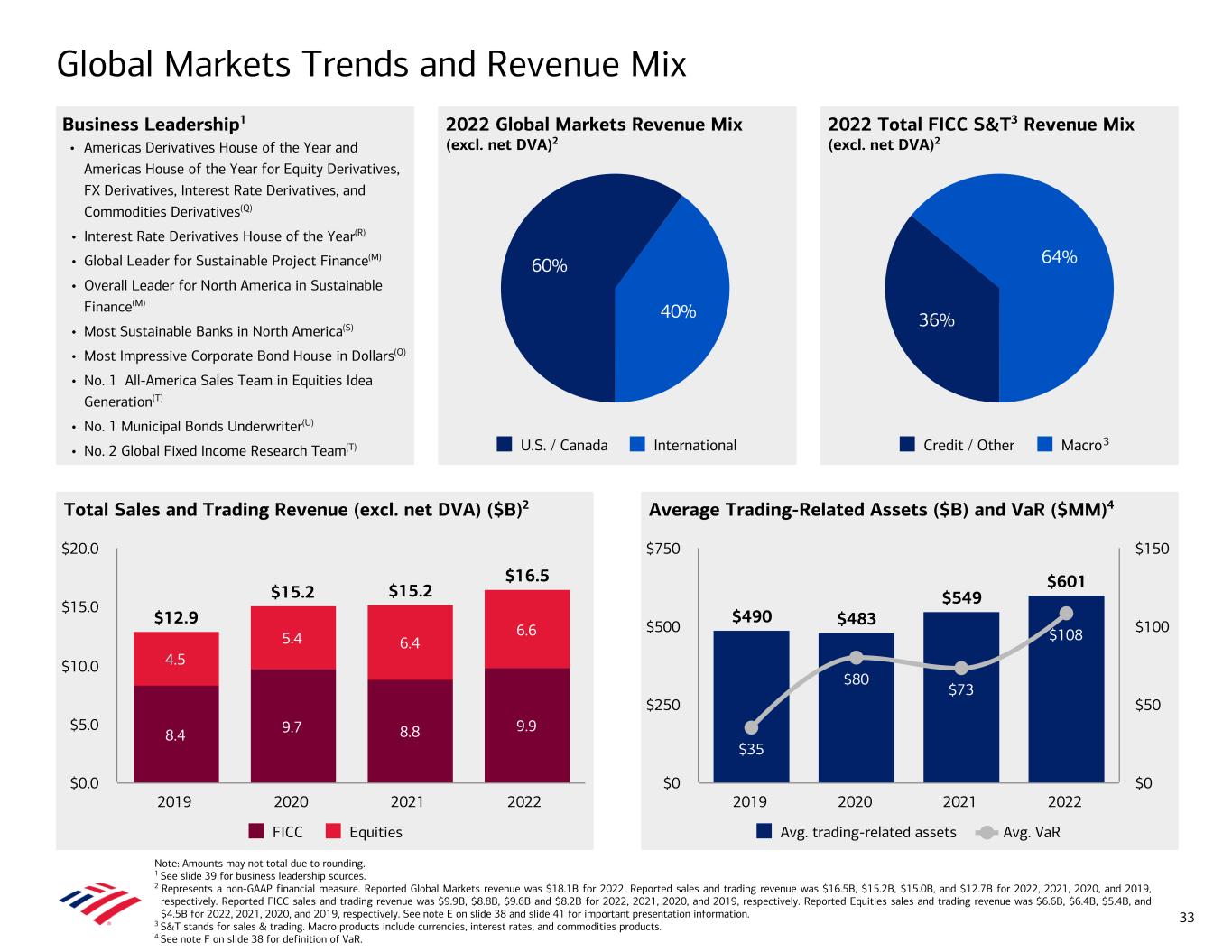 Global Markets Trends and Revenue Mix Note: Amounts may not total due to rounding. 1 See slide 39 for business leadership sources. 2 Represents a non-GAAP financial measure. Reported Global Markets revenue was $18.1B for 2022. Reported sales and trading revenue was $16.5B, $15.2B, $15.0B, and $12.7B for 2022, 2021, 2020, and 2019, respectively. Reported FICC sales and trading revenue was $9.9B, $8.8B, $9.6B and $8.2B for 2022, 2021, 2020, and 2019, respectively. Reported Equities sales and trading revenue was $6.6B, $6.4B, $5.4B, and $4.5B for 2022, 2021, 2020, and 2019, respectively. See note E on slide 38 and slide 41 for important presentation information. 3 S&T stands for sales & trading. Macro products include currencies, interest rates, and commodities products. 4 See note F on slide 38 for definition of VaR. 2022 Global Markets Revenue Mix (excl. net DVA)2 Business Leadership1 • Americas Derivatives House of the Year and Americas House of the Year for Equity Derivatives, FX Derivatives, Interest Rate Derivatives, and Commodities Derivatives(Q) • Interest Rate Derivatives House of the Year(R) • Global Leader for Sustainable Project Finance(M) • Overall Leader for North America in Sustainable Finance(M) • Most Sustainable Banks in North America(S) • Most Impressive Corporate Bond House in Dollars(Q) • No. 1 All-America Sales Team in Equities Idea Generation(T) • No. 1 Municipal Bonds Underwriter(U) • No. 2 Global Fixed Income Research Team(T) 2022 Total FICC S&T3 Revenue Mix (excl. net DVA)2 Total Sales and Trading Revenue (excl. net DVA) ($B)2 Average Trading-Related Assets ($B) and VaR ($MM)4 $12.9 $15.2 $15.2 $16.5 8.4 9.7 8.8 9.9 4.5 5.4 6.4 6.6 FICC Equities 2019 2020 2021 2022 $0.0 $5.0 $10.0 $15.0 $20.0 $490 $483 $549 $601 $35 $80 $73 $108 Avg. trading-related assets Avg. VaR 2019 2020 2021 2022 $0 $250 $500 $750 $0 $50 $100 $150 60% 40% U.S. / Canada International 36% 64% Credit / Other Macro3 33