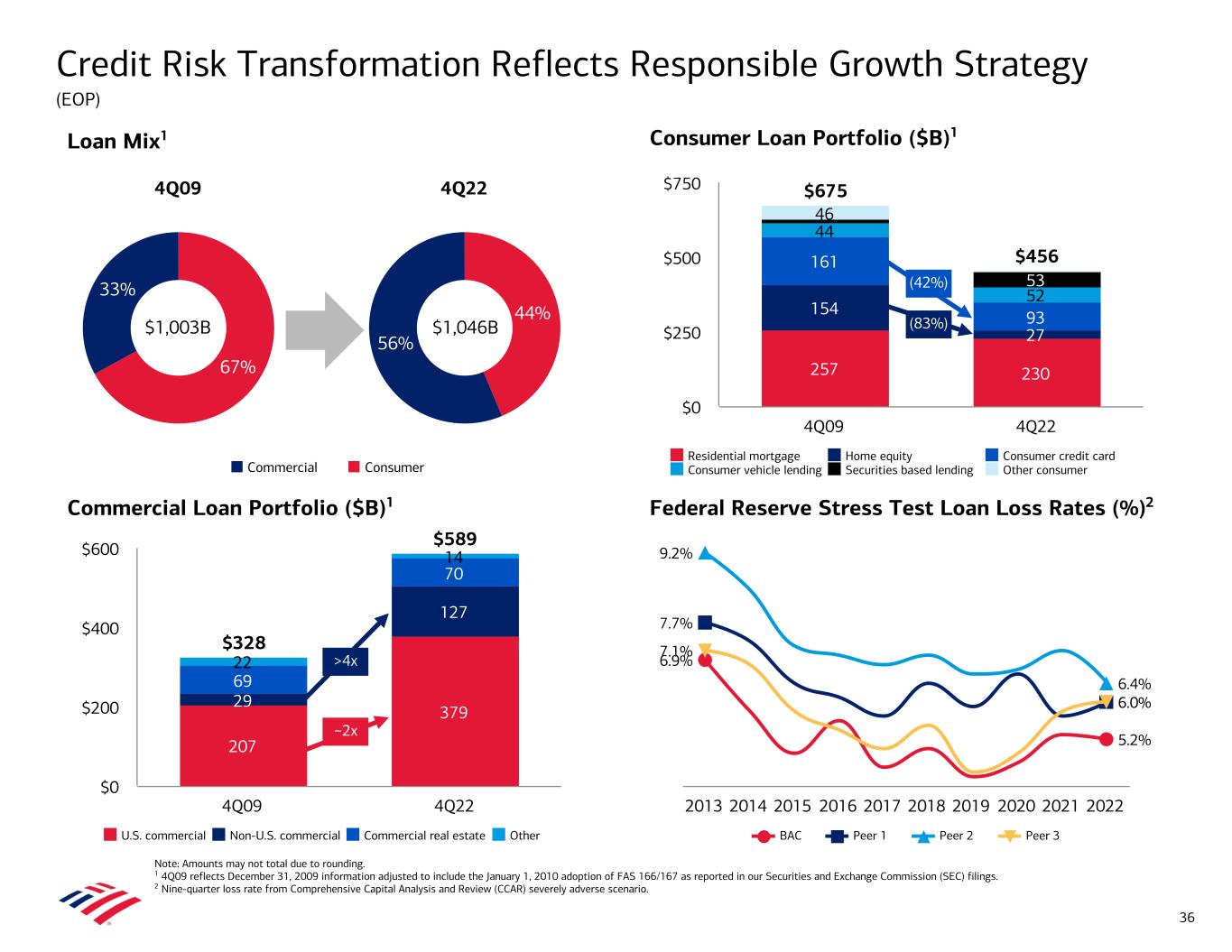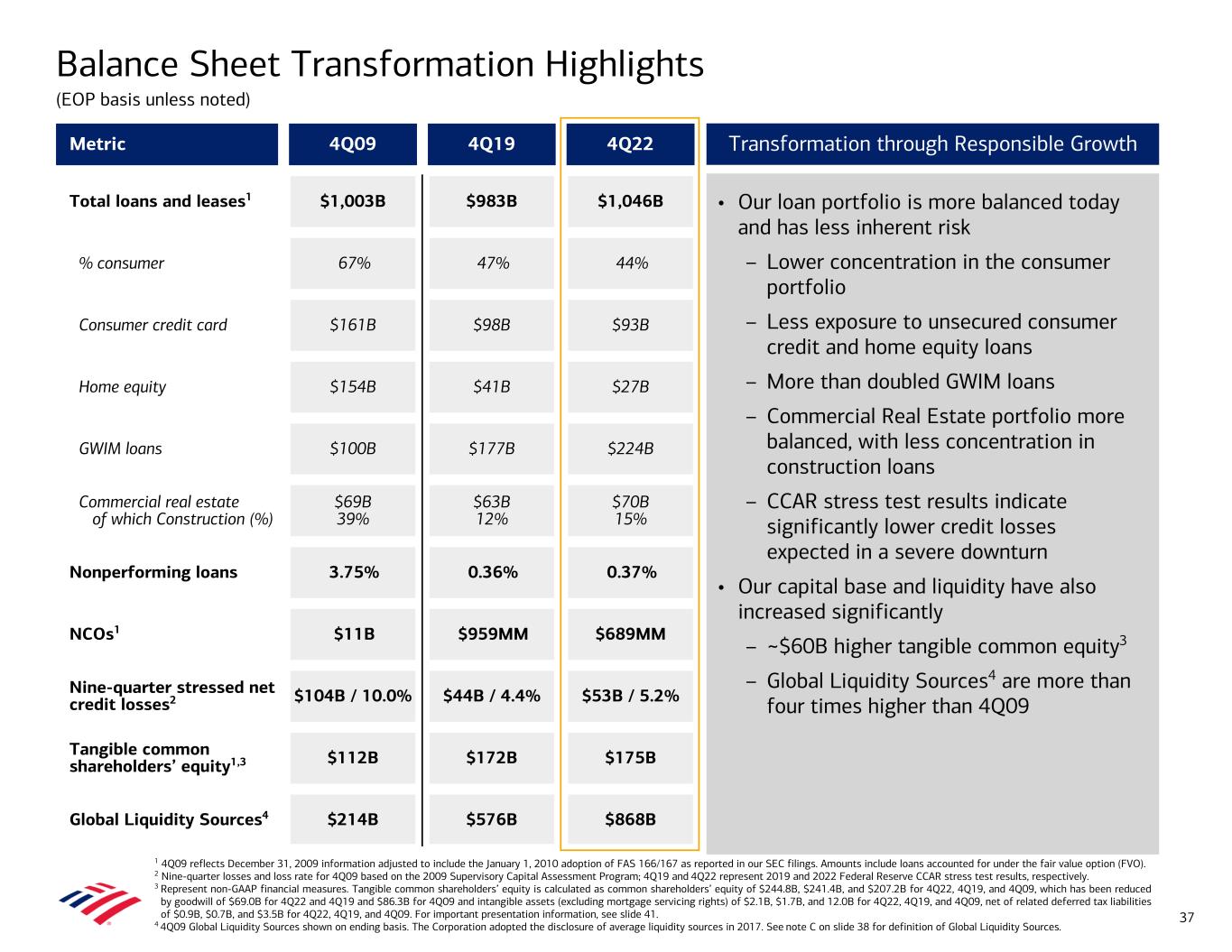 $675 $456 257 230 154 27 161 93 44 52 53 46 Residential mortgage Home equity Consumer credit card Consumer vehicle lending Securities based lending Other consumer 4Q09 4Q22 $0 $250 $500 $750 Credit Risk Transformation Reflects Responsible Growth Strategy (EOP) Note: Amounts may not total due to rounding. 1 4Q09 reflects December 31, 2009 information adjusted to include the January 1, 2010 adoption of FAS 166/167 as reported in our Securities and Exchange Commission (SEC) filings. 2 Nine-quarter loss rate from Comprehensive Capital Analysis and Review (CCAR) severely adverse scenario. Consumer Loan Portfolio ($B)1 Commercial Loan Portfolio ($B)1 Federal Reserve Stress Test Loan Loss Rates (%)2 Loan Mix1 36 $328 $589 207 379 29 127 69 70 22 14 U.S. commercial Non-U.S. commercial Commercial real estate Other 4Q09 4Q22 $0 $200 $400 $600 4Q09 67% 33% 4Q22 44% 56% $1,046B$1,003B 6.9% 5.2% 7.7% 6.0% 9.2% 6.4% 7.1% BAC Peer 1 Peer 2 Peer 3 2013 2014 2015 2016 2017 2018 2019 2020 2021 2022 (42%) (83%) ~2x >4x Commercial Consumer