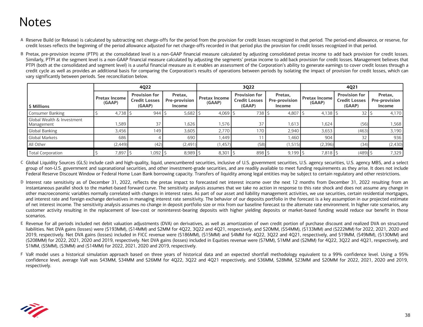 A Reserve Build (or Release) is calculated by subtracting net charge-offs for the period from the provision for credit losses recognized in that period. The period-end allowance, or reserve, for credit losses reflects the beginning of the period allowance adjusted for net charge-offs recorded in that period plus the provision for credit losses recognized in that period. B Pretax, pre-provision income (PTPI) at the consolidated level is a non-GAAP financial measure calculated by adjusting consolidated pretax income to add back provision for credit losses. Similarly, PTPI at the segment level is a non-GAAP financial measure calculated by adjusting the segments’ pretax income to add back provision for credit losses. Management believes that PTPI (both at the consolidated and segment level) is a useful financial measure as it enables an assessment of the Corporation’s ability to generate earnings to cover credit losses through a credit cycle as well as provides an additional basis for comparing the Corporation's results of operations between periods by isolating the impact of provision for credit losses, which can vary significantly between periods. See reconciliation below. C Global Liquidity Sources (GLS) include cash and high-quality, liquid, unencumbered securities, inclusive of U.S. government securities, U.S. agency securities, U.S. agency MBS, and a select group of non-U.S. government and supranational securities, and other investment-grade securities, and are readily available to meet funding requirements as they arise. It does not include Federal Reserve Discount Window or Federal Home Loan Bank borrowing capacity. Transfers of liquidity among legal entities may be subject to certain regulatory and other restrictions. D Interest rate sensitivity as of December 31, 2022, reflects the pretax impact to forecasted net interest income over the next 12 months from December 31, 2022 resulting from an instantaneous parallel shock to the market-based forward curve. The sensitivity analysis assumes that we take no action in response to this rate shock and does not assume any change in other macroeconomic variables normally correlated with changes in interest rates. As part of our asset and liability management activities, we use securities, certain residential mortgages, and interest rate and foreign exchange derivatives in managing interest rate sensitivity. The behavior of our deposits portfolio in the forecast is a key assumption in our projected estimate of net interest income. The sensitivity analysis assumes no change in deposit portfolio size or mix from our baseline forecast to the alternate rate environment. In higher rate scenarios, any customer activity resulting in the replacement of low-cost or noninterest-bearing deposits with higher yielding deposits or market-based funding would reduce our benefit in those scenarios. E Revenue for all periods included net debit valuation adjustments (DVA) on derivatives, as well as amortization of own credit portion of purchase discount and realized DVA on structured liabilities. Net DVA gains (losses) were ($193MM), ($14MM) and $2MM for 4Q22, 3Q22 and 4Q21, respectively, and $20MM, ($54MM), ($133MM) and ($222MM) for 2022, 2021, 2020 and 2019, respectively. Net DVA gains (losses) included in FICC revenue were ($186MM), ($15MM) and $4MM for 4Q22, 3Q22 and 4Q21, respectively, and $19MM, ($49MM), ($130MM) and ($208MM) for 2022, 2021, 2020 and 2019, respectively. Net DVA gains (losses) included in Equities revenue were ($7MM), $1MM and ($2MM) for 4Q22, 3Q22 and 4Q21, respectively, and $1MM, ($5MM), ($3MM) and ($14MM) for 2022, 2021, 2020 and 2019, respectively. F VaR model uses a historical simulation approach based on three years of historical data and an expected shortfall methodology equivalent to a 99% confidence level. Using a 95% confidence level, average VaR was $43MM, $34MM and $26MM for 4Q22, 3Q22 and 4Q21 respectively, and $36MM, $28MM, $23MM and $20MM for 2022, 2021, 2020 and 2019, respectively. Notes $ Millions 4Q22 3Q22 4Q21 Pretax Income (GAAP) Provision for Credit Losses (GAAP) Pretax, Pre-provision Income Pretax Income (GAAP) Provision for Credit Losses (GAAP) Pretax, Pre-provision Income Pretax Income (GAAP) Provision for Credit Losses (GAAP) Pretax, Pre-provision Income Consumer Banking $ 4,738 $ 944 $ 5,682 $ 4,069 $ 738 $ 4,807 $ 4,138 $ 32 $ 4,170 Global Wealth & Investment Management 1,589 37 1,626 1,576 37 1,613 1,624 (56) 1,568 Global Banking 3,456 149 3,605 2,770 170 2,940 3,653 (463) 3,190 Global Markets 686 4 690 1,449 11 1,460 904 32 936 All Other (2,449) (42) (2,491) (1,457) (58) (1,515) (2,396) (34) (2,430) Total Corporation $ 7,897 $ 1,092 $ 8,989 $ 8,301 $ 898 $ 9,199 $ 7,818 $ (489) $ 7,329 38