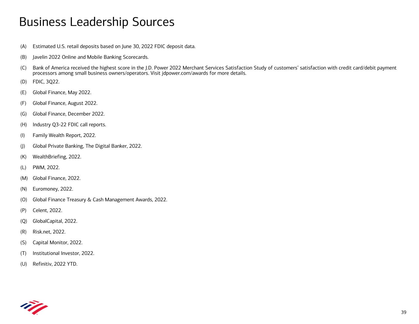 Business Leadership Sources (A) Estimated U.S. retail deposits based on June 30, 2022 FDIC deposit data. (B) Javelin 2022 Online and Mobile Banking Scorecards. (C) Bank of America received the highest score in the J.D. Power 2022 Merchant Services Satisfaction Study of customers’ satisfaction with credit card/debit payment processors among small business owners/operators. Visit jdpower.com/awards for more details. (D) FDIC, 3Q22. (E) Global Finance, May 2022. (F) Global Finance, August 2022. (G) Global Finance, December 2022. (H) Industry Q3-22 FDIC call reports. (I) Family Wealth Report, 2022. (J) Global Private Banking, The Digital Banker, 2022. (K) WealthBriefing, 2022. (L) PWM, 2022. (M) Global Finance, 2022. (N) Euromoney, 2022. (O) Global Finance Treasury & Cash Management Awards, 2022. (P) Celent, 2022. (Q) GlobalCapital, 2022. (R) Risk.net, 2022. (S) Capital Monitor, 2022. (T) Institutional Investor, 2022. (U) Refinitiv, 2022 YTD. 39