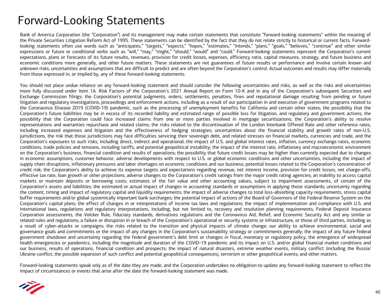 Forward-Looking Statements Bank of America Corporation (the “Corporation”) and its management may make certain statements that constitute “forward-looking statements” within the meaning of the Private Securities Litigation Reform Act of 1995. These statements can be identified by the fact that they do not relate strictly to historical or current facts. Forward- looking statements often use words such as “anticipates,” “targets,” “expects,” “hopes,” “estimates,” “intends,” “plans,” “goals,” “believes,” “continue” and other similar expressions or future or conditional verbs such as “will,” “may,” “might,” “should,” “would” and “could.” Forward-looking statements represent the Corporation’s current expectations, plans or forecasts of its future results, revenues, provision for credit losses, expenses, efficiency ratio, capital measures, strategy, and future business and economic conditions more generally, and other future matters. These statements are not guarantees of future results or performance and involve certain known and unknown risks, uncertainties and assumptions that are difficult to predict and are often beyond the Corporation’s control. Actual outcomes and results may differ materially from those expressed in, or implied by, any of these forward-looking statements. You should not place undue reliance on any forward-looking statement and should consider the following uncertainties and risks, as well as the risks and uncertainties more fully discussed under Item 1A. Risk Factors of the Corporation’s 2021 Annual Report on Form 10-K and in any of the Corporation’s subsequent Securities and Exchange Commission filings: the Corporation’s potential judgments, orders, settlements, penalties, fines and reputational damage resulting from pending or future litigation and regulatory investigations, proceedings and enforcement actions, including as a result of our participation in and execution of government programs related to the Coronavirus Disease 2019 (COVID-19) pandemic, such as the processing of unemployment benefits for California and certain other states; the possibility that the Corporation's future liabilities may be in excess of its recorded liability and estimated range of possible loss for litigation, and regulatory and government actions; the possibility that the Corporation could face increased claims from one or more parties involved in mortgage securitizations; the Corporation’s ability to resolve representations and warranties repurchase and related claims; the risks related to the discontinuation of the London Interbank Offered Rate and other reference rates, including increased expenses and litigation and the effectiveness of hedging strategies; uncertainties about the financial stability and growth rates of non-U.S. jurisdictions, the risk that those jurisdictions may face difficulties servicing their sovereign debt, and related stresses on financial markets, currencies and trade, and the Corporation’s exposures to such risks, including direct, indirect and operational; the impact of U.S. and global interest rates, inflation, currency exchange rates, economic conditions, trade policies and tensions, including tariffs, and potential geopolitical instability; the impact of the interest rate, inflationary and macroeconomic environment on the Corporation’s business, financial condition and results of operations; the possibility that future credit losses may be higher than currently expected due to changes in economic assumptions, customer behavior, adverse developments with respect to U.S. or global economic conditions and other uncertainties, including the impact of supply chain disruptions, inflationary pressures and labor shortages on economic conditions and our business; potential losses related to the Corporation’s concentration of credit risk; the Corporation's ability to achieve its expense targets and expectations regarding revenue, net interest income, provision for credit losses, net charge-offs, effective tax rate, loan growth or other projections; adverse changes to the Corporation’s credit ratings from the major credit rating agencies; an inability to access capital markets or maintain deposits or borrowing costs; estimates of the fair value and other accounting values, subject to impairment assessments, of certain of the Corporation’s assets and liabilities; the estimated or actual impact of changes in accounting standards or assumptions in applying those standards; uncertainty regarding the content, timing and impact of regulatory capital and liquidity requirements; the impact of adverse changes to total loss-absorbing capacity requirements, stress capital buffer requirements and/or global systemically important bank surcharges; the potential impact of actions of the Board of Governors of the Federal Reserve System on the Corporation’s capital plans; the effect of changes in or interpretations of income tax laws and regulations; the impact of implementation and compliance with U.S. and international laws, regulations and regulatory interpretations, including, but not limited to, recovery and resolution planning requirements, Federal Deposit Insurance Corporation assessments, the Volcker Rule, fiduciary standards, derivatives regulations and the Coronavirus Aid, Relief, and Economic Security Act and any similar or related rules and regulations; a failure or disruption in or breach of the Corporation’s operational or security systems or infrastructure, or those of third parties, including as a result of cyber-attacks or campaigns; the risks related to the transition and physical impacts of climate change; our ability to achieve environmental, social and governance goals and commitments or the impact of any changes in the Corporation's sustainability strategy or commitments generally; the impact of any future federal government shutdown and uncertainty regarding the