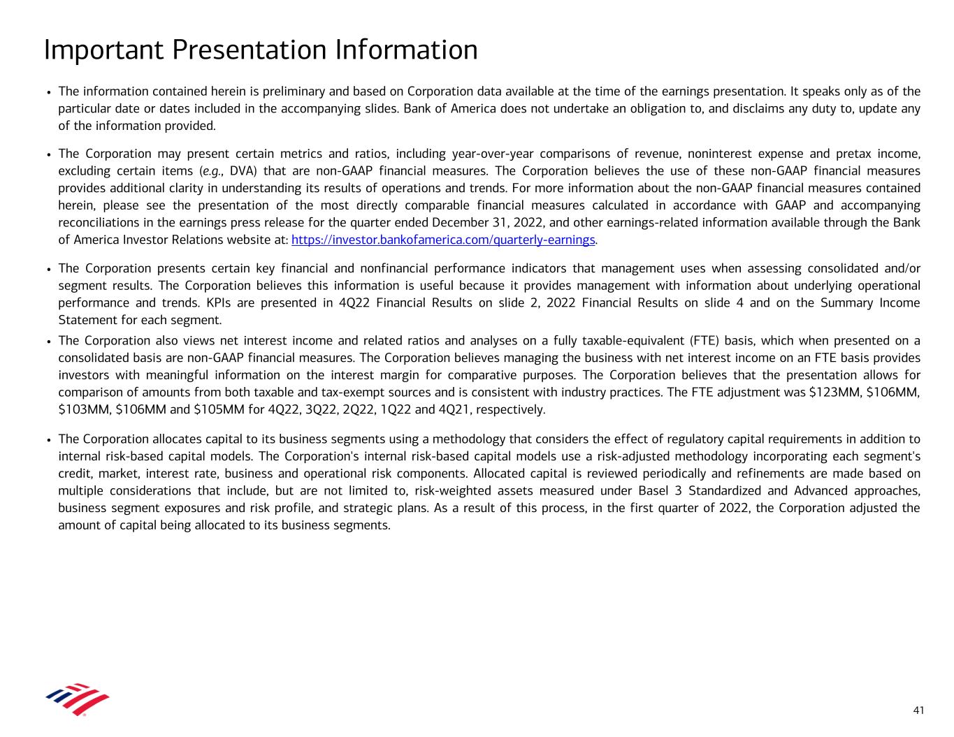 Important Presentation Information 41 • The information contained herein is preliminary and based on Corporation data available at the time of the earnings presentation. It speaks only as of the particular date or dates included in the accompanying slides. Bank of America does not undertake an obligation to, and disclaims any duty to, update any of the information provided. • The Corporation may present certain metrics and ratios, including year-over-year comparisons of revenue, noninterest expense and pretax income, excluding certain items (e.g., DVA) that are non-GAAP financial measures. The Corporation believes the use of these non-GAAP financial measures provides additional clarity in understanding its results of operations and trends. For more information about the non-GAAP financial measures contained herein, please see the presentation of the most directly comparable financial measures calculated in accordance with GAAP and accompanying reconciliations in the earnings press release for the quarter ended December 31, 2022, and other earnings-related information available through the Bank of America Investor Relations website at: https://investor.bankofamerica.com/quarterly-earnings. • The Corporation presents certain key financial and nonfinancial performance indicators that management uses when assessing consolidated and/or segment results. The Corporation believes this information is useful because it provides management with information about underlying operational performance and trends. KPIs are presented in 4Q22 Financial Results on slide 2, 2022 Financial Results on slide 4 and on the Summary Income Statement for each segment. • The Corporation also views net interest income and related ratios and analyses on a fully taxable-equivalent (FTE) basis, which when presented on a consolidated basis are non-GAAP financial measures. The Corporation believes managing the business with net interest income on an FTE basis provides investors with meaningful information on the interest margin for comparative purposes. The Corporation believes that the presentation allows for comparison of amounts from both taxable and tax-exempt sources and is consistent with industry practices. The FTE adjustment was $123MM, $106MM, $103MM, $106MM and $105MM for 4Q22, 3Q22, 2Q22, 1Q22 and 4Q21, respectively. • The Corporation allocates capital to its business segments using a methodology that considers the effect of regulatory capital requirements in addition to internal risk-based capital models. The Corporation's internal risk-based capital models use a risk-adjusted methodology incorporating each segment's credit, market, interest rate, business and operational risk components. Allocated capital is reviewed periodically and refinements are made based on multiple considerations that include, but are not limited to, risk-weighted assets measured under Basel 3 Standardized and Advanced approaches, business segment exposures and risk profile, and strategic plans. As a result of this process, in the first quarter of 2022, the Corporation adjusted the amount of capital being allocated to its business segments.