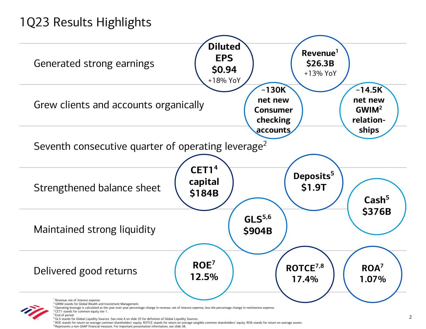 1Q23 Highlights (Comparisons to 1Q22, unless otherwise noted) • Net income of $8.2B; diluted earnings per share of $0.94; ROE 12.5%, ROTCE 17.4%1 • Revenue, net of interest expense, of $26.3B increased $3.0B, or 13% – Net interest income (NII) of $14.4B ($14.6B FTE1) increased $2.9B, or 25%, driven primarily by benefits from higher interest rates and solid loan growth – Noninterest income of $11.8B increased $154MM, or 1%, as higher sales and trading revenue more than offset lower service charges and declines in asset management and investment banking fees • Provision for credit losses of $931MM – Net reserve build of $124MM vs. net reserve release of $362MM in 1Q22; build of $403MM in 4Q222 – Net charge-offs (NCOs) of $807MM increased compared to 1Q22 and 4Q22 and remained below pre-pandemic levels – Net charge-off ratio of 32 bps increased 16 bps vs. 1Q22 and 6 bps vs. 4Q22 • Noninterest expense of $16.2B increased $0.9B, or 6%, vs. 1Q22 – Generated operating leverage3 for the seventh consecutive quarter (705 bps in 1Q23) • Balance sheet remained strong – Average loans and leases grew $2B from 4Q22 – Average deposits decreased $32B from 4Q22 – Common Equity Tier 1 ratio of 11.4% increased 14 bps from 4Q22 – Average Global Liquidity Sources of $854B; ending Global Liquidity Sources of $904B4 – Paid $1.8B in common dividends and repurchased $2.2B of common stock, including repurchases to offset shares awarded under equity-based compensation plans 3 Note: FTE stands for fully taxable-equivalent basis. 1 Represent non-GAAP financial measures. For important presentation information about these measures, see slide 38. 2 For more information on reserve build (release), see note B on slide 35. Net charge-offs exclude loans measured at fair value. 3 Operating leverage is calculated as the year-over-year percentage change in revenue, net of interest expense, less the percentage change in noninterest expense. 4 See note A on slide 35 for definition of Global Liquidity Sources.