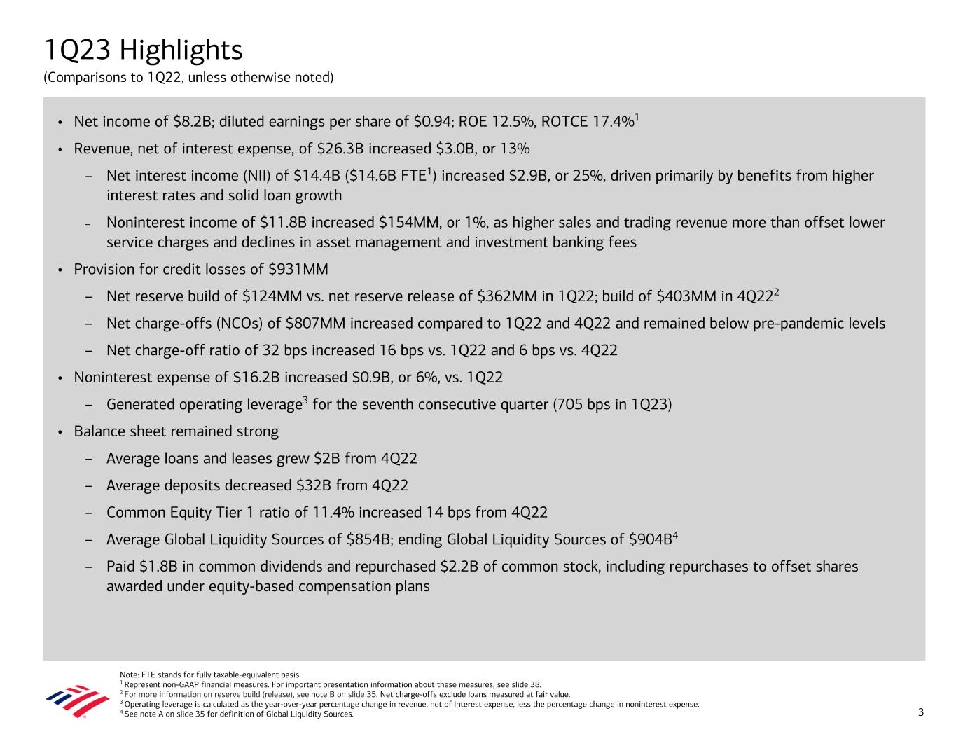 1Q23 Results Highlights 2 Generated strong earnings Grew clients and accounts organically Seventh consecutive quarter of operating leverage2 Strengthened balance sheet Maintained strong liquidity Delivered good returns Diluted EPS $0.94 +18% YoY CET14 capital $184B GLS5,6 $904B ROTCE7,8 17.4% ROE7 12.5% Cash5 $376B ~130K net new Consumer checking accounts ~14.5K net new GWIM2 relation- ships 1 Revenue, net of interest expense. 2 GWIM stands for Global Wealth and Investment Management. 3 Operating leverage is calculated as the year-over-year percentage change in revenue, net of interest expense, less the percentage change in noninterest expense. 4 CET1 stands for common equity tier 1. 5 End of period. 6 GLS stands for Global Liquidity Sources. See note A on slide 35 for definition of Global Liquidity Sources. 7 ROE stands for return on average common shareholders’ equity. ROTCE stands for return on average tangible common shareholders’ equity. ROA stands for return on average assets. 8 Represents a non-GAAP financial measure. For important presentation information, see slide 38. Revenue1 $26.3B +13% YoY Deposits5 $1.9T ROA7 1.07%