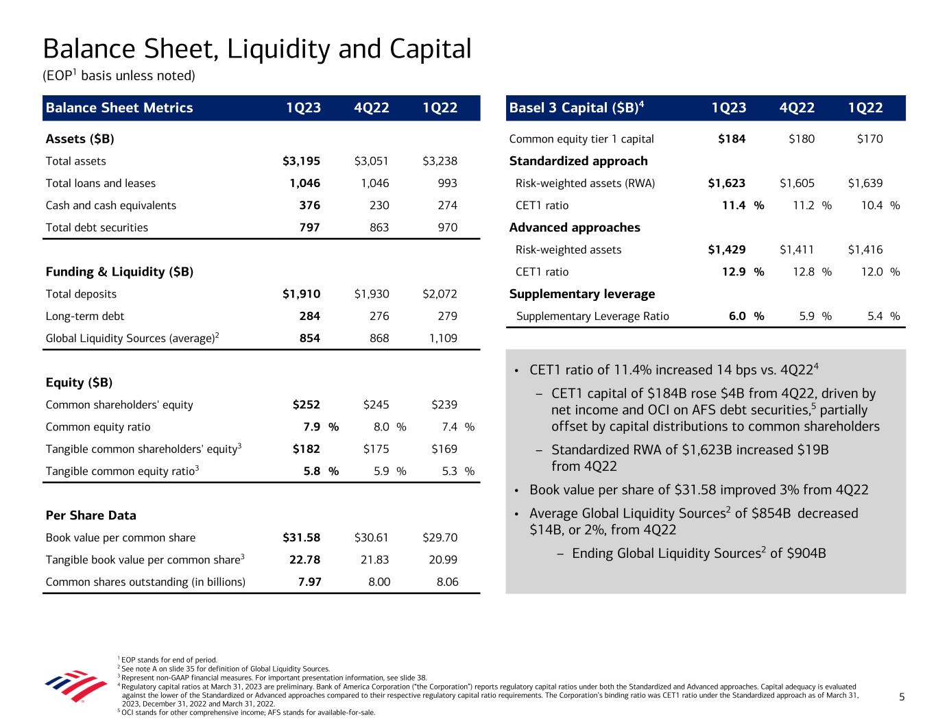 Balance Sheet Metrics 1Q23 4Q22 1Q22 Basel 3 Capital ($B)4 1Q23 4Q22 1Q22 Assets ($B) Common equity tier 1 capital $184 $180 $170 Total assets $3,195 $3,051 $3,238 Standardized approach Total loans and leases 1,046 1,046 993 Risk-weighted assets (RWA) $1,623 $1,605 $1,639 Cash and cash equivalents 376 230 274 CET1 ratio 11.4 % 11.2 % 10.4 % Total debt securities 797 863 970 Advanced approaches Risk-weighted assets $1,429 $1,411 $1,416 Funding & Liquidity ($B) CET1 ratio 12.9 % 12.8 % 12.0 % Total deposits $1,910 $1,930 $2,072 Supplementary leverage Long-term debt 284 276 279 Supplementary Leverage Ratio 6.0 % 5.9 % 5.4 % Global Liquidity Sources (average)2 854 868 1,109 Equity ($B) Common shareholders' equity $252 $245 $239 Common equity ratio 7.9 % 8.0 % 7.4 % Tangible common shareholders' equity3 $182 $175 $169 Tangible common equity ratio3 5.8 % 5.9 % 5.3 % Per Share Data Book value per common share $31.58 $30.61 $29.70 Tangible book value per common share3 22.78 21.83 20.99 Common shares outstanding (in billions) 7.97 8.00 8.06 1 EOP stands for end of period. 2 See note A on slide 35 for definition of Global Liquidity Sources. 3 Represent non-GAAP financial measures. For important presentation information, see slide 38. 4 Regulatory capital ratios at March 31, 2023 are preliminary. Bank of America Corporation (“the Corporation”) reports regulatory capital ratios under both the Standardized and Advanced approaches. Capital adequacy is evaluated against the lower of the Standardized or Advanced approaches compared to their respective regulatory capital ratio requirements. The Corporation’s binding ratio was CET1 ratio under the Standardized approach as of March 31, 2023, December 31, 2022 and March 31, 2022. 5 OCI stands for other comprehensive income; AFS stands for available-for-sale. Balance Sheet, Liquidity and Capital (EOP1 basis unless noted) 5 • CET1 ratio of 11.4% increased 14 bps vs. 4Q224 – CET1 capital of $184B rose $4B from 4Q22, driven by net income and OCI on AFS debt securities,5 partially offset by capital distributions to common shareholders – Standardized RWA of $1,623B increased $19B from 4Q22 • Book value per share of $31.58 improved 3% from 4Q22 • Average Global Liquidity Sources2 of $854B decreased $14B, or 2%, from 4Q22 – Ending Global Liquidity Sources2 of $904B
