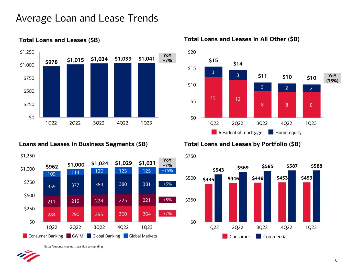 $962 $1,000 $1,024 $1,029 $1,031 284 290 295 300 304 211 219 224 225 221 359 377 384 380 381 109 114 120 123 125 Consumer Banking GWIM Global Banking Global Markets 1Q22 2Q22 3Q22 4Q22 1Q23 $0 $250 $500 $750 $1,000 $1,250 $978 $1,015 $1,034 $1,039 $1,041 1Q22 2Q22 3Q22 4Q22 1Q23 $0 $250 $500 $750 $1,000 $1,250 +7% +5% +6% +15% Average Loan and Lease Trends YoY +7% YoY +7% YoY (35%) Note: Amounts may not total due to rounding. Total Loans and Leases in All Other ($B) Loans and Leases in Business Segments ($B) Total Loans and Leases by Portfolio ($B) Total Loans and Leases ($B) $435 $446 $449 $453 $453 $543 $569 $585 $587 $588 Consumer Commercial 1Q22 2Q22 3Q22 4Q22 1Q23 $0 $250 $500 $750 6 12 12 8 8 8 3 3 3 2 2 $15 $14 $11 $10 $10 Residential mortgage Home equity 1Q22 2Q22 3Q22 4Q22 1Q23 $0 $5 $10 $15 $20