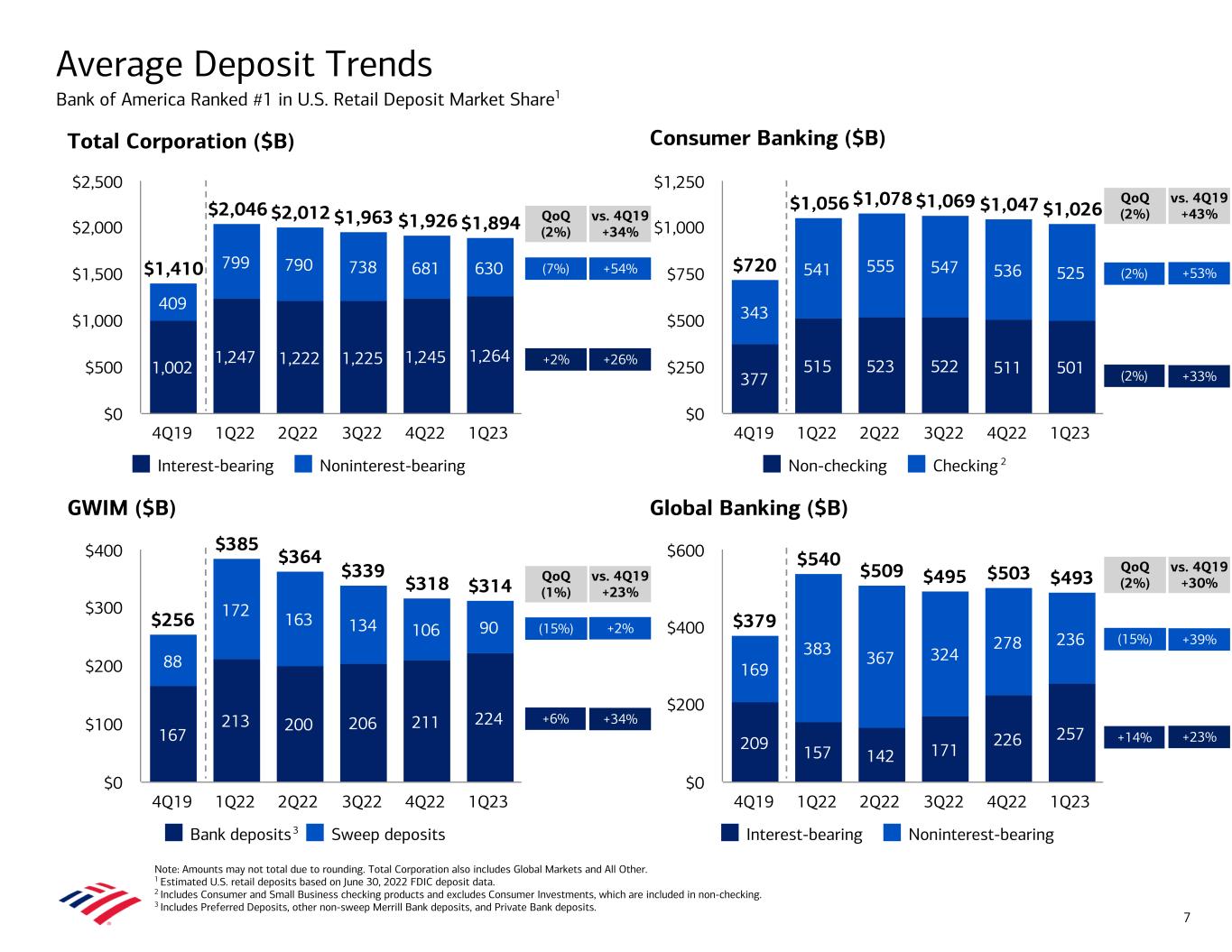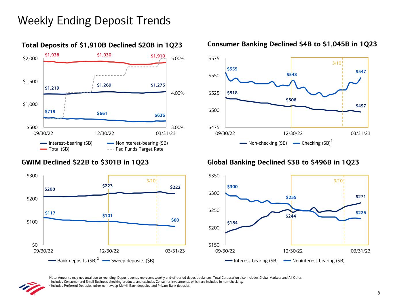 Consumer Banking ($B) GWIM ($B) Global Banking ($B) Total Corporation ($B) Average Deposit Trends Bank of America Ranked #1 in U.S. Retail Deposit Market Share1 Note: Amounts may not total due to rounding. Total Corporation also includes Global Markets and All Other. 1 Estimated U.S. retail deposits based on June 30, 2022 FDIC deposit data. 2 Includes Consumer and Small Business checking products and excludes Consumer Investments, which are included in non-checking. 3 Includes Preferred Deposits, other non-sweep Merrill Bank deposits, and Private Bank deposits. $256 $385 $364 $339 $318 $314 167 213 200 206 211 224 88 172 163 134 106 90 Bank deposits Sweep deposits 4Q19 1Q22 2Q22 3Q22 4Q22 1Q23 $0 $100 $200 $300 $400 $1,410 $2,046 $2,012 $1,963 $1,926 $1,894 1,002 1,247 1,222 1,225 1,245 1,264 409 799 790 738 681 630 Interest-bearing Noninterest-bearing 4Q19 1Q22 2Q22 3Q22 4Q22 1Q23 $0 $500 $1,000 $1,500 $2,000 $2,500 $379 $540 $509 $495 $503 $493 209 157 142 171 226 257 169 383 367 324 278 236 Interest-bearing Noninterest-bearing 4Q19 1Q22 2Q22 3Q22 4Q22 1Q23 $0 $200 $400 $600 +6% (15%) +2% (7%) QoQ (2%) QoQ (1%) QoQ (2%) +14% (15%) (2%) QoQ (2%) 7 $720 $1,056 $1,078 $1,069 $1,047 $1,026 377 515 523 522 511 501 343 541 555 547 536 525 Non-checking Checking 4Q19 1Q22 2Q22 3Q22 4Q22 1Q23 $0 $250 $500 $750 $1,000 $1,250 (2%) 2 +26% +54% vs. 4Q19 +34% +34% +2% vs. 4Q19 +23% +33% +53% vs. 4Q19 +43% +23% +39% vs. 4Q19 +30% 3