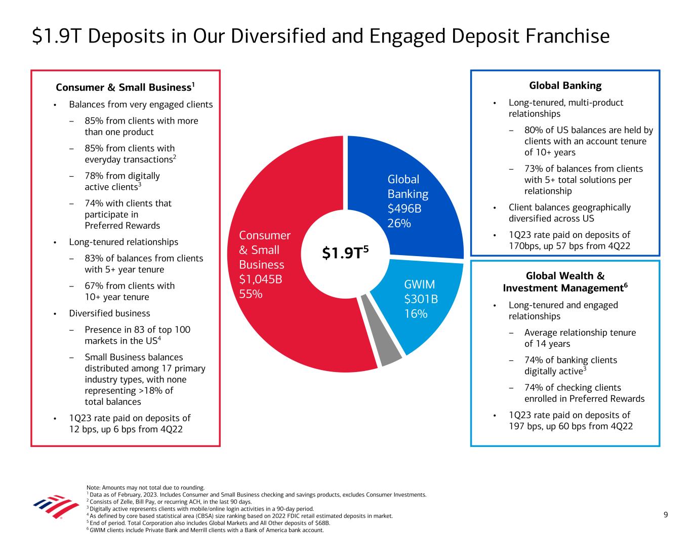 $497 $547 Non-checking ($B) Checking ($B) 09/30/22 12/30/22 03/31/23 $475 $500 $525 $550 $575 $271 $225 Interest-bearing ($B) Noninterest-bearing ($B) 09/30/22 12/30/22 03/31/23 $150 $200 $250 $300 $350 $222 $80 Bank deposits ($B) Sweep deposits ($B) 09/30/22 12/30/22 03/31/23 $0 $100 $200 $300 Interest-bearing ($B) Noninterest-bearing ($B) Total ($B) Fed Funds Target Rate 09/30/22 12/30/22 03/31/23 $500 $1,000 $1,500 $2,000 3.00% 4.00% 5.00% Consumer Banking Declined $4B to $1,045B in 1Q23 GWIM Declined $22B to $301B in 1Q23 Global Banking Declined $3B to $496B in 1Q23 Total Deposits of $1,910B Declined $20B in 1Q23 Weekly Ending Deposit Trends 8 $555 $184 $300 $518 Note: Amounts may not total due to rounding. Deposit trends represent weekly end-of-period deposit balances. Total Corporation also includes Global Markets and All Other. 1 Includes Consumer and Small Business checking products and excludes Consumer Investments, which are included in non-checking. 2 Includes Preferred Deposits, other non-sweep Merrill Bank deposits, and Private Bank deposits. $208 $117 $1,938 $1,219 $719 $1,910 $1,275 $636 3/10 3/103/10 1 $1,930 $1,269 $661 $543 $506 $244 $255 $223 $101 2