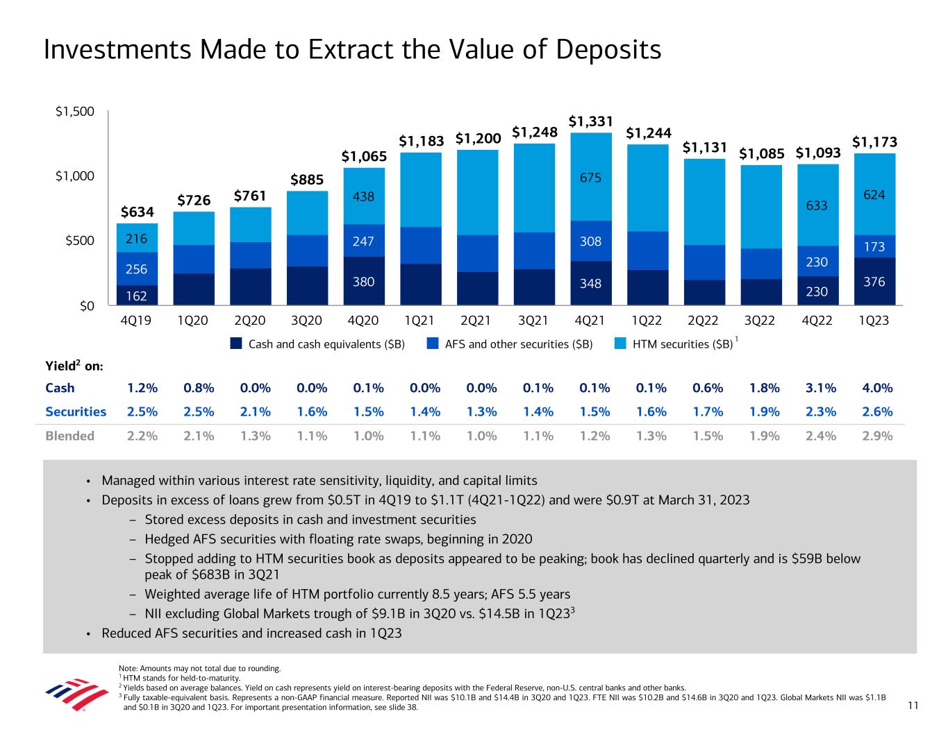 Strong Excess Deposits Drove Need to Invest (EOP, $T) 10 $1.4 $1.6 $1.7 $1.7 $1.8 $1.9 $1.9 $2.0 $2.1 $2.1 $2.0 $1.9 $1.9 $1.9 1.4 1.6 1.7 1.7 1.8 1.9 1.9 2.0 2.1 2.1 2.0 1.9 1.9 1.9 1.0 1.1 1.0 1.0 0.9 0.9 0.9 0.9 1.0 1.0 1.0 1.0 1.0 1.0 0.5 0.5 0.7 0.7 0.9 1.0 1.0 1.0 1.1 1.1 1.0 0.9 0.9 0.9 Deposits Loans Deposits in excess of loans 4Q19 1Q20 2Q20 3Q20 4Q20 1Q21 2Q21 3Q21 4Q21 1Q22 2Q22 3Q22 4Q22 1Q23 Note: Amounts may not total due to rounding.