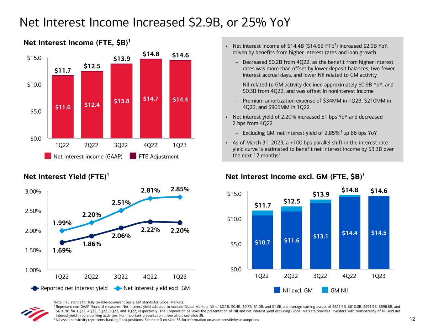 Net Interest Income (FTE, $B)1 • Net interest income of $14.4B ($14.6B FTE1) increased $2.9B YoY, driven by benefits from higher interest rates and loan growth – Decreased $0.2B from 4Q22, as the benefit from higher interest rates was more than offset by lower deposit balances, two fewer interest accrual days, and lower NII related to GM activity – NII related to GM activity declined approximately $0.9B YoY, and $0.3B from 4Q22, and was offset in noninterest income – Premium amortization expense of $34MM in 1Q23, $210MM in 4Q22, and $905MM in 1Q22 • Net interest yield of 2.20% increased 51 bps YoY and decreased 2 bps from 4Q22 – Excluding GM, net interest yield of 2.85%;1 up 86 bps YoY • As of March 31, 2023, a +100 bps parallel shift in the interest rate yield curve is estimated to benefit net interest income by $3.3B over the next 12 months2 Net Interest Income Increased $2.9B, or 25% YoY Net Interest Yield (FTE)1 Note: FTE stands for fully taxable-equivalent basis. GM stands for Global Markets. 1 Represent non-GAAP financial measures. Net interest yield adjusted to exclude Global Markets NII of $0.1B, $0.4B, $0.7B, $1.0B, and $1.0B and average earning assets of $627.9B, $610.0B, $591.9B, $598.8B, and $610.9B for 1Q23, 4Q22, 3Q22, 2Q22, and 1Q22, respectively. The Corporation believes the presentation of NII and net interest yield excluding Global Markets provides investors with transparency of NII and net interest yield in core banking activities. For important presentation information, see slide 38. 2 NII asset sensitivity represents banking book positions. See note D on slide 35 for information on asset sensitivity assumptions. 1.69% 1.86% 2.06% 2.22% 2.20% 1.99% 2.20% 2.51% 2.81% 2.85% Reported net interest yield Net interest yield excl. GM 1Q22 2Q22 3Q22 4Q22 1Q23 1.00% 1.50% 2.00% 2.50% 3.00% $11.7 $12.5 $13.9 $14.8 $14.6 $11.6 $12.4 $13.8 $14.7 $14.4 Net interest income (GAAP) FTE Adjustment 1Q22 2Q22 3Q22 4Q22 1Q23 $0.0 $5.0 $10.0 $15.0 12 Net Interest Income excl. GM (FTE, $B)1 $11.7 $12.5 $13.9 $14.8 $14.6 $10.7 $11.6 $13.1 $14.4 $14.5 NII excl. GM GM NII 1Q22 2Q22 3Q22 4Q22 1Q23 $0.0 $5.0 $10.0 $15.0