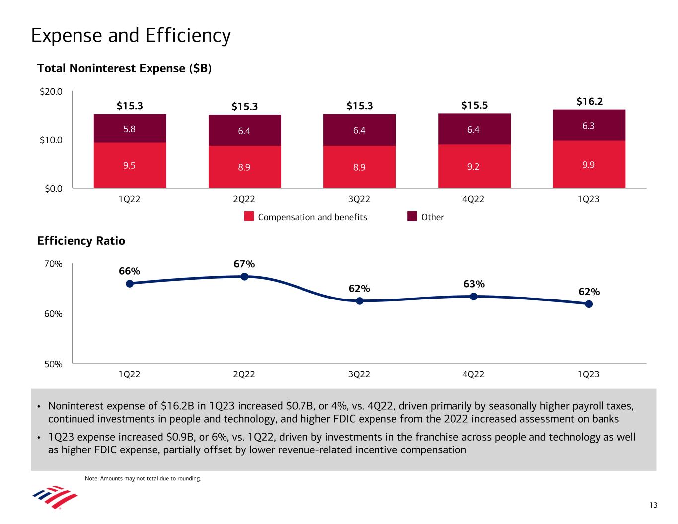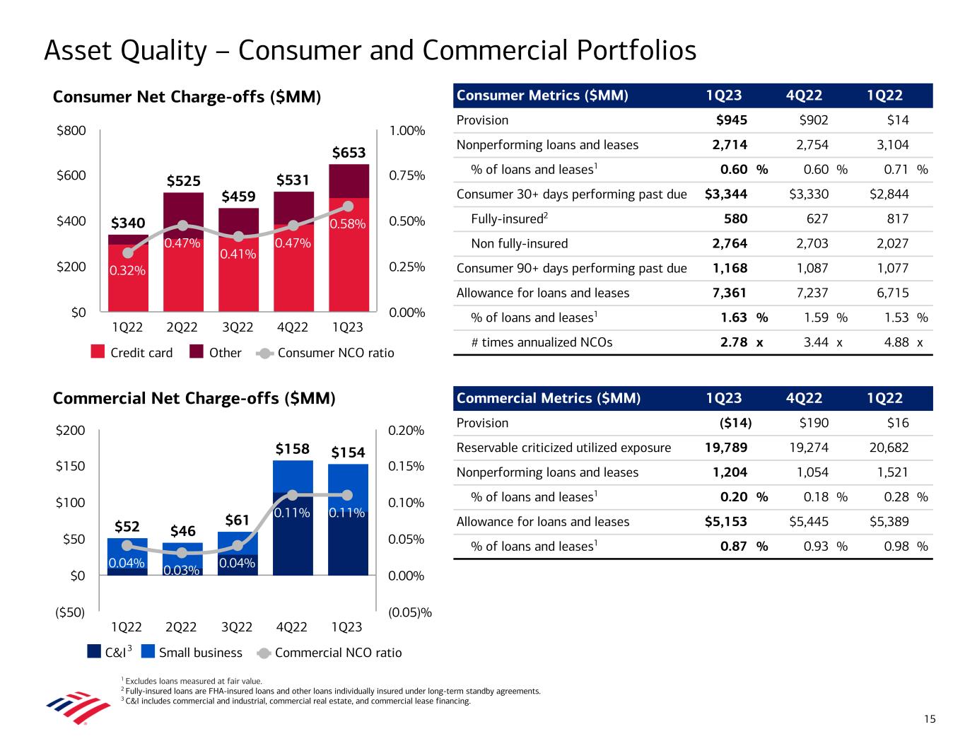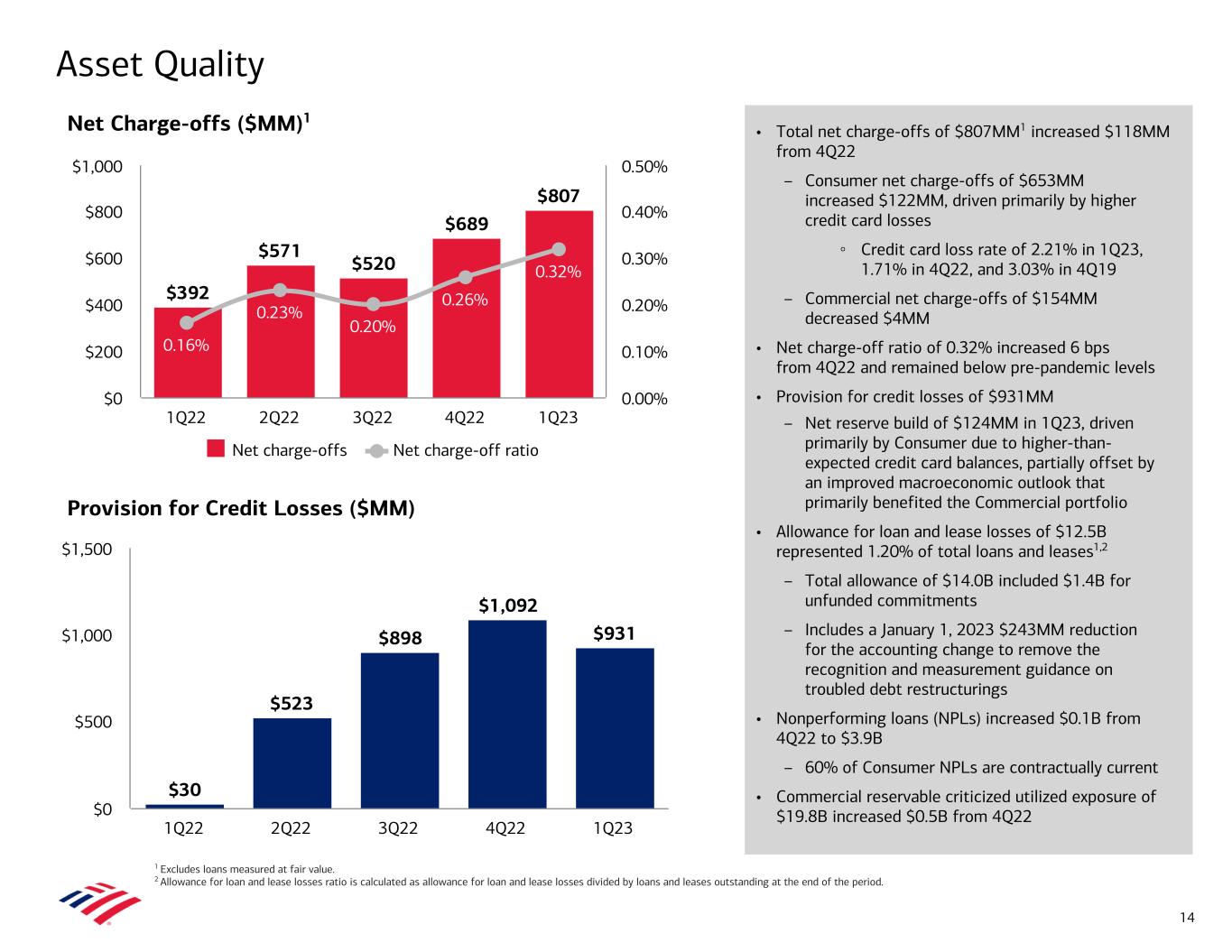 • Total net charge-offs of $807MM1 increased $118MM from 4Q22 – Consumer net charge-offs of $653MM increased $122MM, driven primarily by higher credit card losses ◦ Credit card loss rate of 2.21% in 1Q23, 1.71% in 4Q22, and 3.03% in 4Q19 – Commercial net charge-offs of $154MM decreased $4MM • Net charge-off ratio of 0.32% increased 6 bps from 4Q22 and remained below pre-pandemic levels • Provision for credit losses of $931MM – Net reserve build of $124MM in 1Q23, driven primarily by Consumer due to higher-than- expected credit card balances, partially offset by an improved macroeconomic outlook that primarily benefited the Commercial portfolio • Allowance for loan and lease losses of $12.5B represented 1.20% of total loans and leases1,2 – Total allowance of $14.0B included $1.4B for unfunded commitments – Includes a January 1, 2023 $243MM reduction for the accounting change to remove the recognition and measurement guidance on troubled debt restructurings • Nonperforming loans (NPLs) increased $0.1B from 4Q22 to $3.9B – 60% of Consumer NPLs are contractually current • Commercial reservable criticized utilized exposure of $19.8B increased $0.5B from 4Q22 Asset Quality 1 Excludes loans measured at fair value. 2 Allowance for loan and lease losses ratio is calculated as allowance for loan and lease losses divided by loans and leases outstanding at the end of the period. Provision for Credit Losses ($MM) Net Charge-offs ($MM)1 $30 $523 $898 $1,092 $931 1Q22 2Q22 3Q22 4Q22 1Q23 $0 $500 $1,000 $1,500 $392 $571 $520 $689 $807 0.16% 0.23% 0.20% 0.26% 0.32% Net charge-offs Net charge-off ratio 1Q22 2Q22 3Q22 4Q22 1Q23 $0 $200 $400 $600 $800 $1,000 0.00% 0.10% 0.20% 0.30% 0.40% 0.50% 14