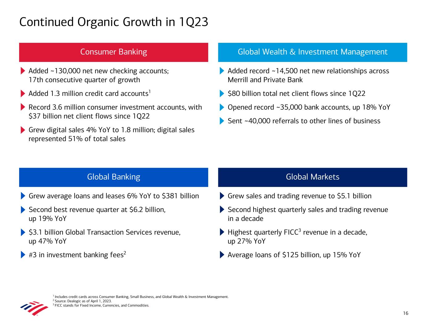Commercial Net Charge-offs ($MM) Consumer Net Charge-offs ($MM) Asset Quality – Consumer and Commercial Portfolios 1 Excludes loans measured at fair value. 2 Fully-insured loans are FHA-insured loans and other loans individually insured under long-term standby agreements. 3 C&I includes commercial and industrial, commercial real estate, and commercial lease financing. $52 $46 $61 $158 $154 0.04% 0.03% 0.04% 0.11% 0.11% C&I Small business Commercial NCO ratio 1Q22 2Q22 3Q22 4Q22 1Q23 ($50) $0 $50 $100 $150 $200 (0.05)% 0.00% 0.05% 0.10% 0.15% 0.20% $340 $525 $459 $531 $653 0.32% 0.47% 0.41% 0.47% 0.58% Credit card Other Consumer NCO ratio 1Q22 2Q22 3Q22 4Q22 1Q23 $0 $200 $400 $600 $800 0.00% 0.25% 0.50% 0.75% 1.00% Commercial Metrics ($MM) 1Q23 4Q22 1Q22 Provision ($14) $190 $16 Reservable criticized utilized exposure 19,789 19,274 20,682 Nonperforming loans and leases 1,204 1,054 1,521 % of loans and leases1 0.20 % 0.18 % 0.28 % Allowance for loans and leases $5,153 $5,445 $5,389 % of loans and leases1 0.87 % 0.93 % 0.98 % Consumer Metrics ($MM) 1Q23 4Q22 1Q22 Provision $945 $902 $14 Nonperforming loans and leases 2,714 2,754 3,104 % of loans and leases1 0.60 % 0.60 % 0.71 % Consumer 30+ days performing past due $3,344 $3,330 $2,844 Fully-insured2 580 627 817 Non fully-insured 2,764 2,703 2,027 Consumer 90+ days performing past due 1,168 1,087 1,077 Allowance for loans and leases 7,361 7,237 6,715 % of loans and leases1 1.63 % 1.59 % 1.53 % # times annualized NCOs 2.78 x 3.44 x 4.88 x 15 3